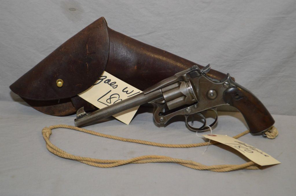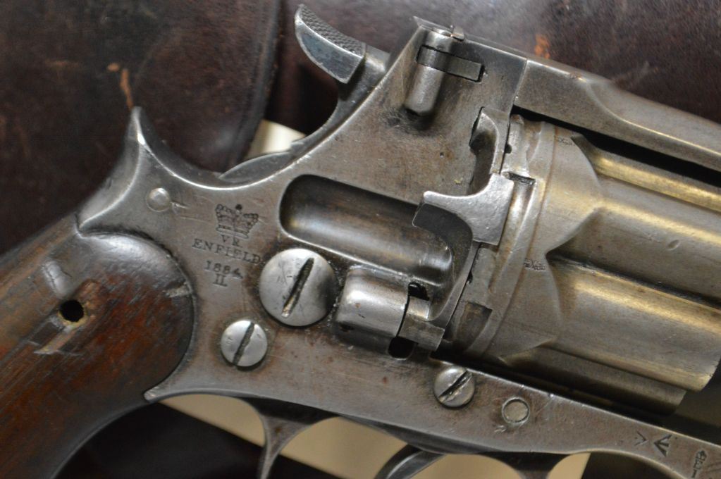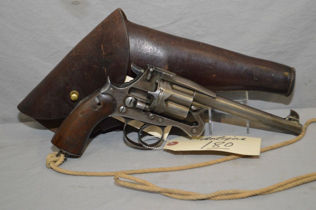 Enfield Model Mark II Dated 1884 .476 Cal 6 Shot Revolver w/ 6" rnd bbl [ fading blue finish, turned brown more in protected areas, Broad Arrow marked, one piece grips with hole thru near top, faded marked NWMP stamp with clear number 309 Canada, with lanyard ring, lanyard, c/w flap leather holster, in Mountie Book ] Ser # A2321 ANTIQUE NO PAL REQ