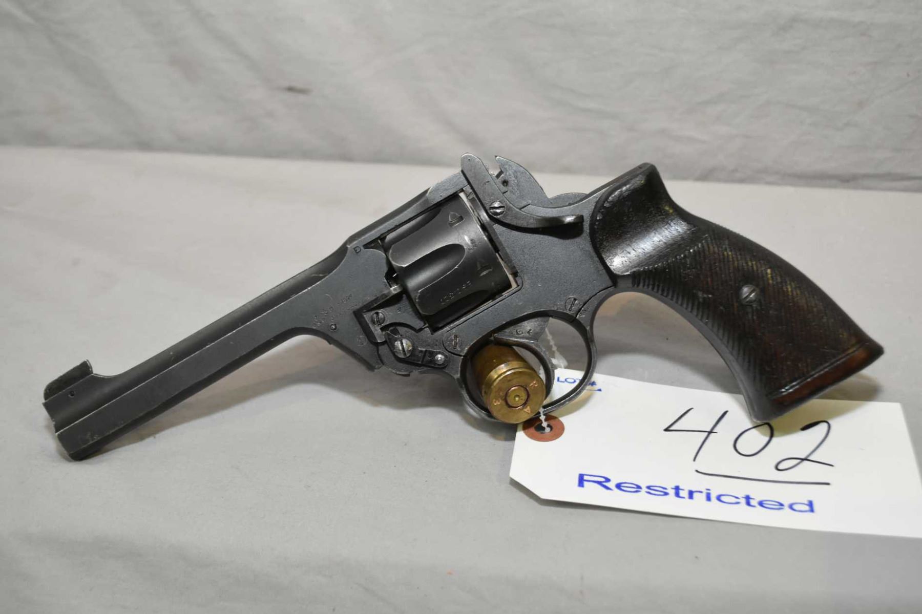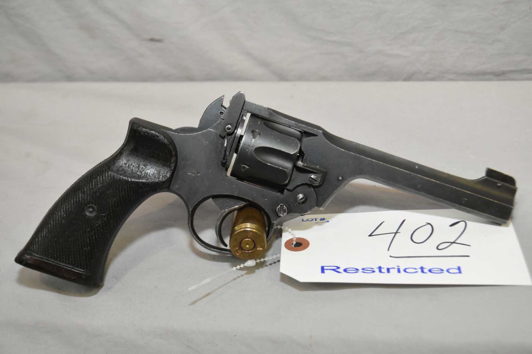 Enfield Model No. 2 MK1* .38 S & W Cal 6 Shot Revolver w/ 127 mm bbl [ flat war finish, Dated 42, good wooden grips with few chips and marks, missing the lanyard ring and stud, Tanker style hammer ] Ser # Q3368 Restricted Handgun Cert # 18935524 FRT # 18794 - 1