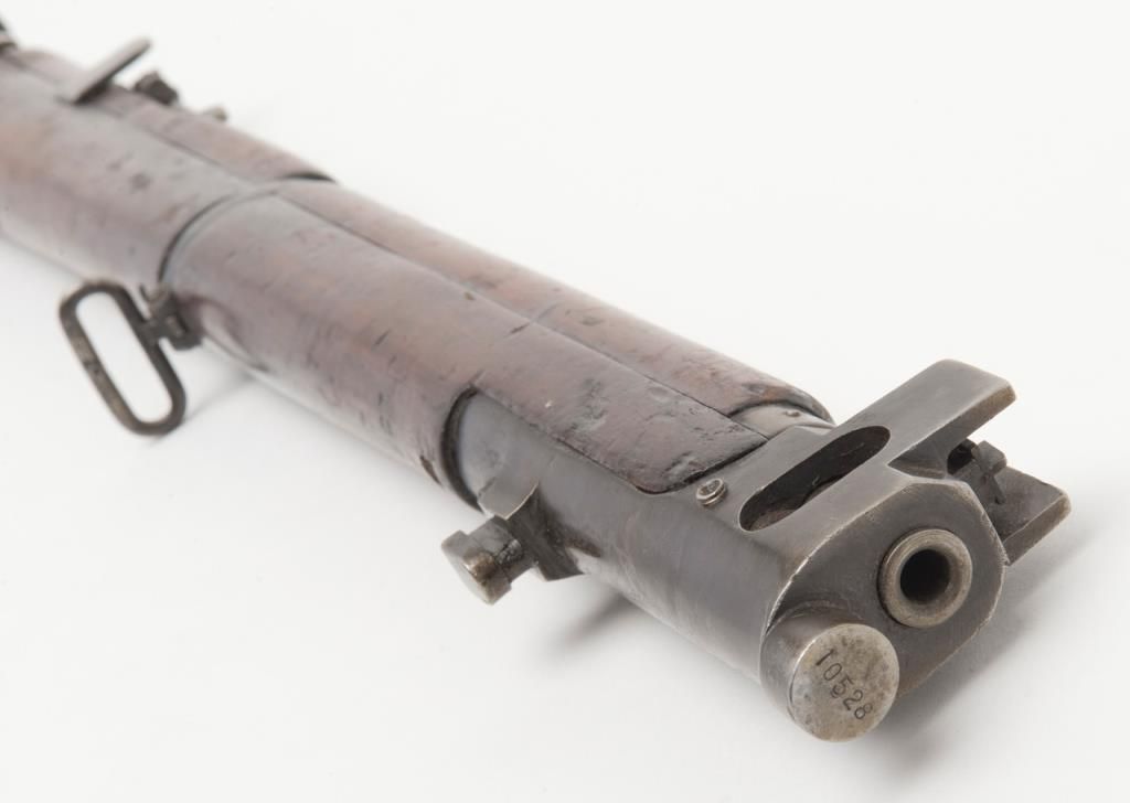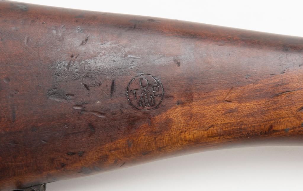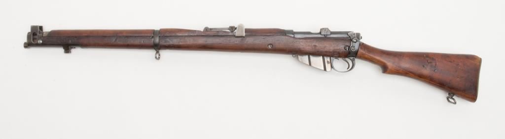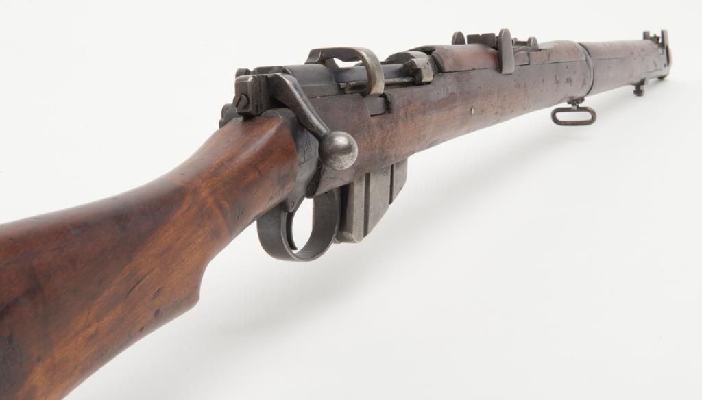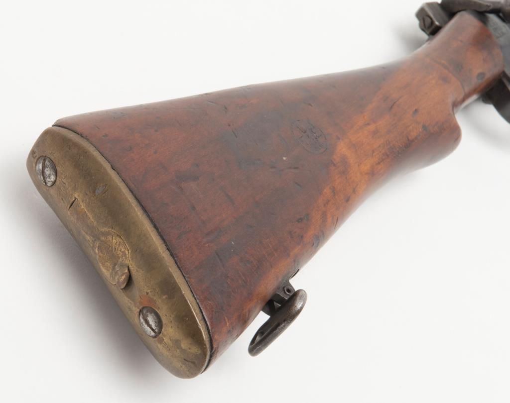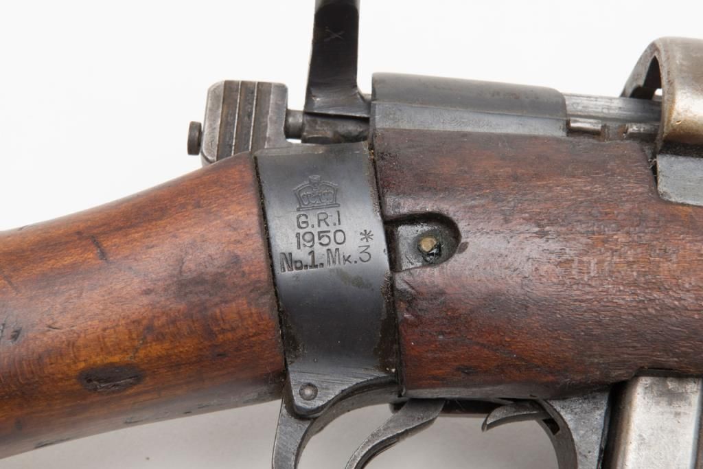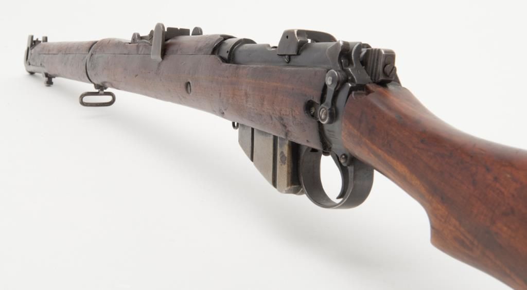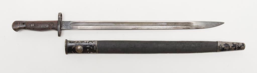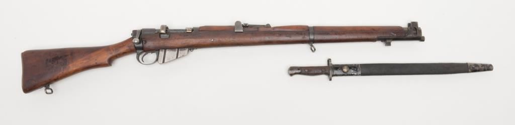 Enfield No. 1 Mk. 3 bolt action rifle, .303 British caliber, Serial #10528. The rifle is in overall fair to good condition with a 25” barrel. The rifle retains a significant amount of its military finish. The smooth wood stocks are inoverall fair condition with numerous mars and compressions consistent with military service. The stocks retain numerous cartouches and is marked “1950” at the wrist. The rifle includes a 23” bayonet with scabbard. The bore is good,action crisp and markings legible on this Enfield. (C+R/PPT). Est. $200-$400.