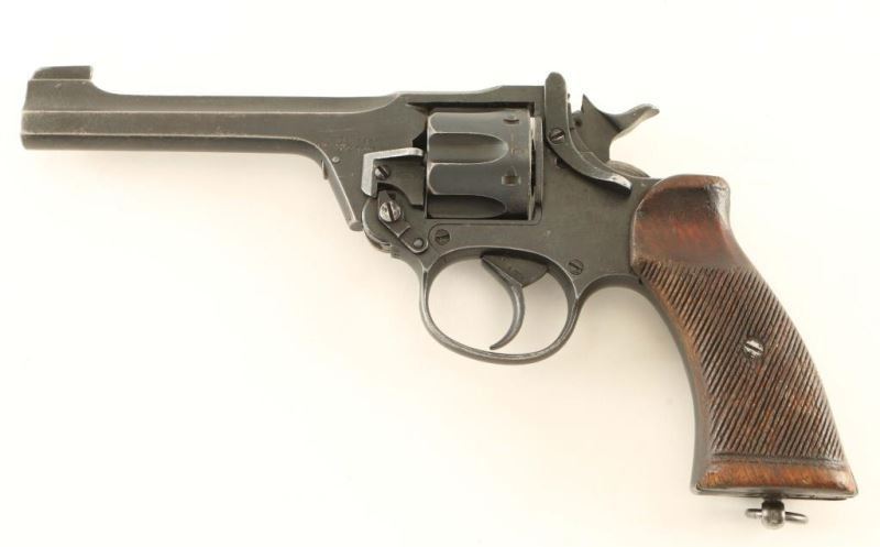 British military D.A. top-break service revolver chambered in .38 S&W, circa 1935. Features a black matte finish, 5" slab sided barrel with contoured rib, patridge front sight, square notched rear sight, fluted six-shot cylinder, smooth trigger, knurled hammer spur, steel frame with a lanyard ring on the butt and grooved two-piece wood grips. The butt is stamped "52. T.R/8.". No visible import marks and the serial numbers match on the frame, barrel & cylinder(forced). Revolver retains approximately 85% of its matte finish showing holster wear and thinning. Action is smooth with good lock-up, bore is excellent and wood grips are good. Condition is good+++. ***C&R Firearm***