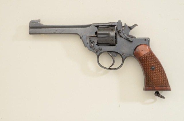 Enfield No. 2 MK 1, 38 D.A. Revolver with 1938 date and R.A.F. markings. Good to very good condition showing better quality than later versions and checkered wood grip with Broadhead proof #E4789. 80-90% Military dull blue, minor erosion and pitting on cyl., bright bore. “Battle of Britain” era during R.A.F.’s finest hours. Full proofs. Est.:$300-$600.