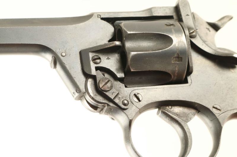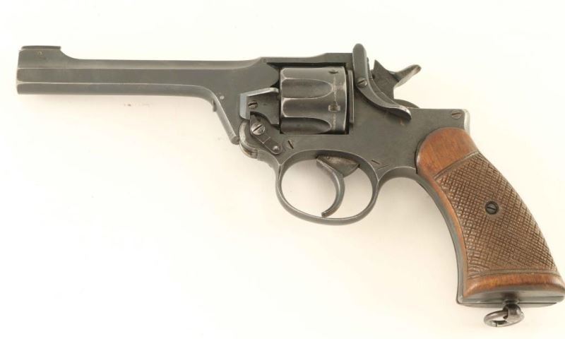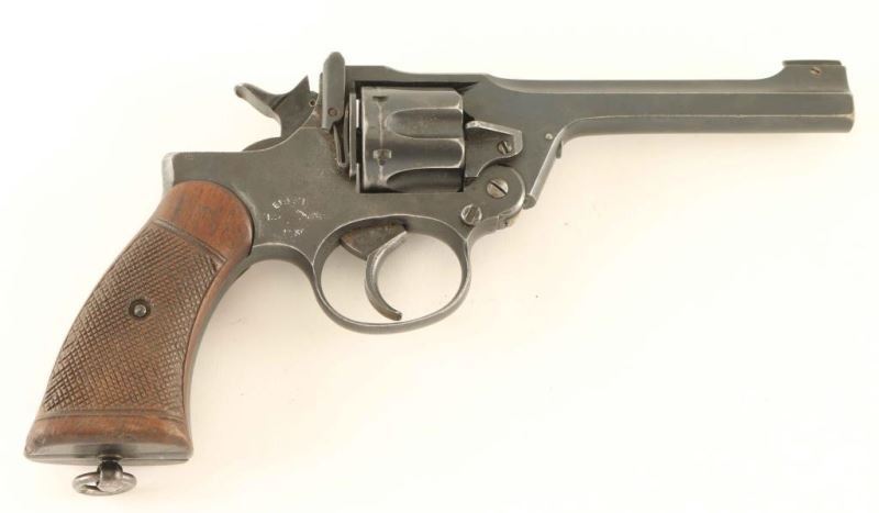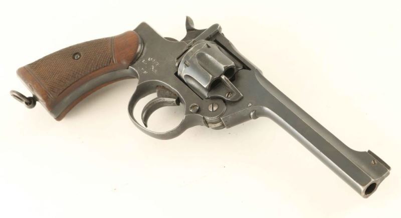 English military top-break double action revolver chambered in .38 Smith & Wesson, dated 1930. Features a blued finish, 5" bbl, low-profile patridge front sight, square notched rear sight on the barrel catch, fluted six-shot cylinder, automatic extractor, smooth trigger, knurled hammer spur, square butt frame with lanyard ring and two-piece checkered walnut grips. The serial numbers on the frame, barrel and cylinder are matching. Markings: Backstrap - "RASC/49.CO/1." Frame - "ENFIELD/No 2[crown]Mk 1/1930" Barrel - "CAL..38.," "30," & military proofs. The revolver exhibits approximately 70% of it's fine blued finish showing light holster wear, a drag line on the cylinder, thinning on the frame and some light pitting under the finish on the barrel catch & cylinder retaining cam. Action is smooth with solid lock-up, bore is good+ with some minor pin prick pitting, markings are very good and the wood grips are very good with worn points. Condition is NRA Good. ***C&R Firearm*** From The John F Sukey Collection
