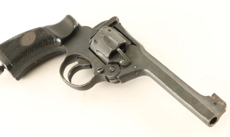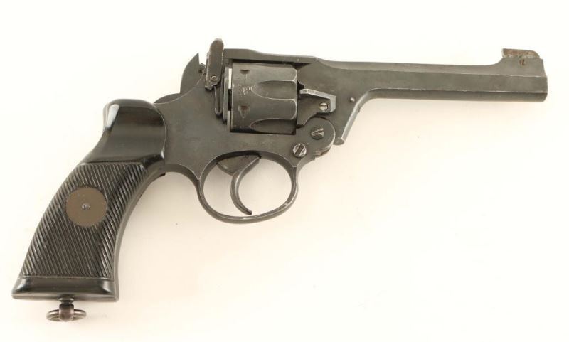 British military D.A.O. top-break service revolver chambered in .38 S&W. Features a black matte finish, 5" slab sided barrel with contoured rib, patridge front sight, square notched rear sight, fluted six-shot cylinder, smooth trigger, bobbed hammer, steel frame with a lanyard ring on the butt and grooved two-piece black composite grips. The frame is stamped "ENGLAND' with no import marks observed and the serial numbers match on the frame, barrel & cylinder. Revolver retains approximately 80% of its matte finish showing edge wear, scattered losses and some light surface rust. Action is smooth with good lock-up, bore is bright with good rifling and composite grips are good. Condition is good++. ***C&R Firearm***