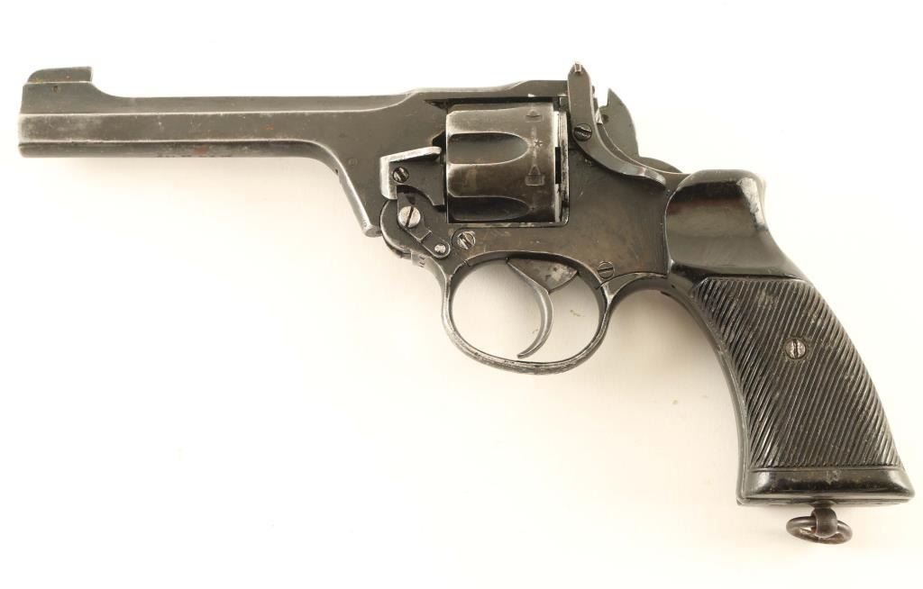 British military revolver imported by CAI, St Albans VT. Features 5" barrel, 6 shot cylinder, break top style opening for loading and unloading, double action only style operation, fixed sights, lanyard ring on butt. No spur on hammer. Bore is good condition, a little dark with strong rifling. Cylinder charge holes are very good condition. Retains 75% blue, some black paint on frame and trigger guard, many scratches and small dents, bare metal on sharp edges & a strip of bare metal on right side. Black plastic checkered grips are in good condition, right panel is a little loose. Number "7" in white paint on right side. Condition is NRA Good *** C&R Firearm ***