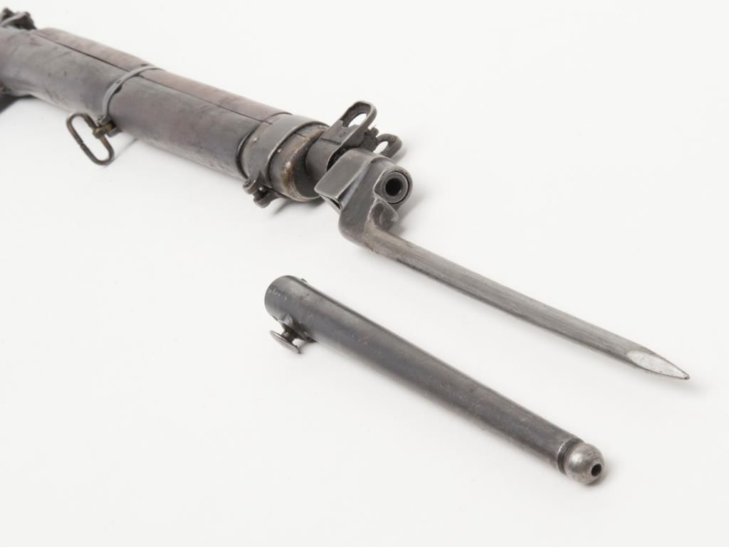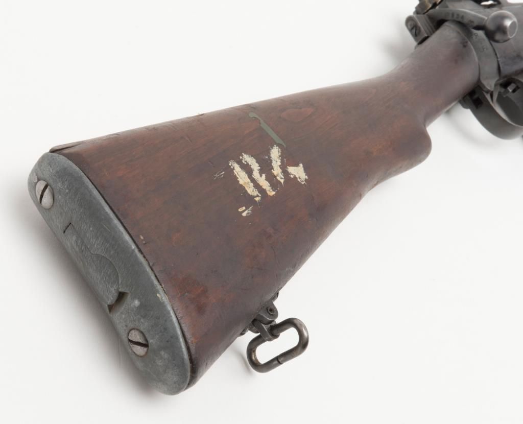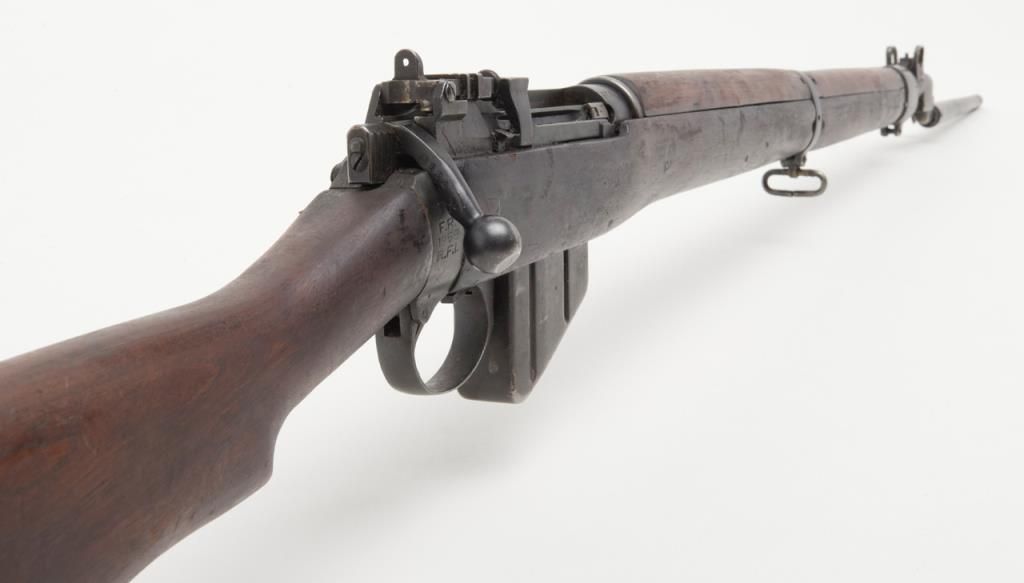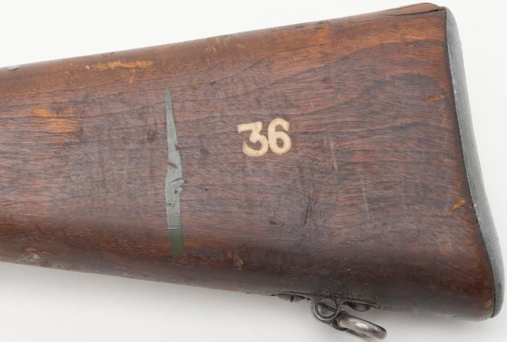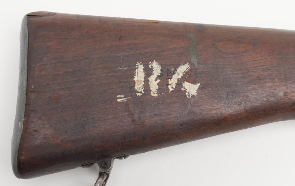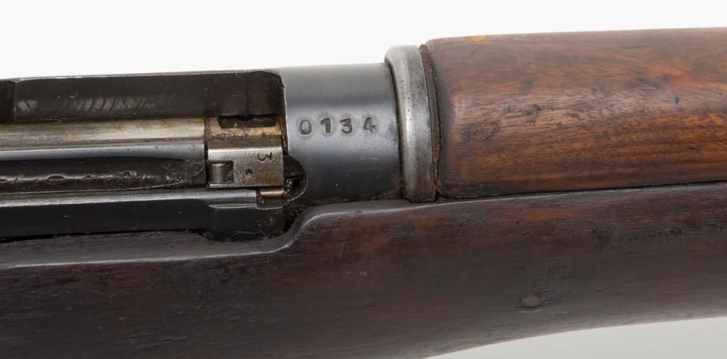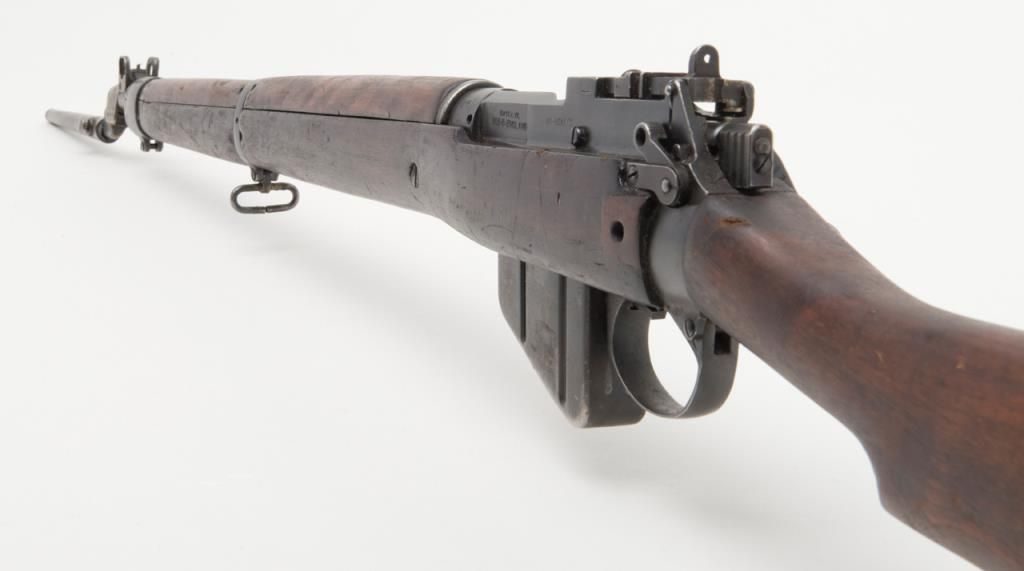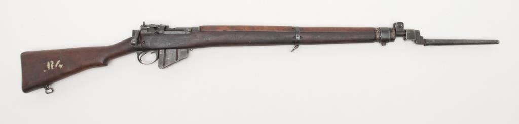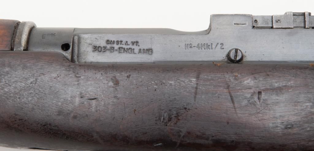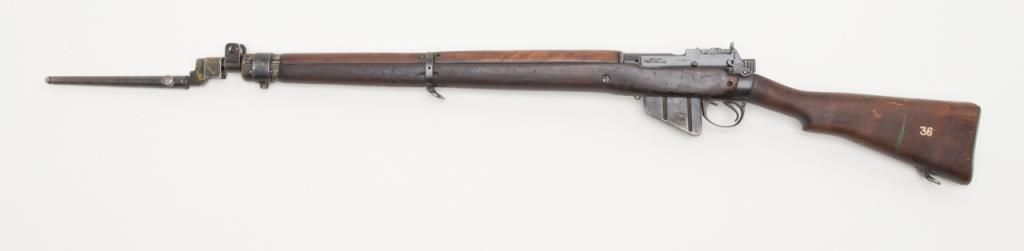 Enfield No. 4Mk. 1/2 bolt action rifle, .303 British caliber, Serial #0134. The rifle is in overall fair to good condition with a 25” barrel. The rifle retains a significant amount of its military finish. The smooth wood stocks are inoverall fair condition with numerous mars and compressions consistent with military service. Additionally, the stock has the number 36 painted on the butt and a textured metal butt plate. The rifle comes with a 10” spike bayonet and scabbard. The rifle is import marked on the action and marked “FR 1959 RFI” at the wrist. The bore is fair, action functions and markings are legible on this Enfield. (C+R/PPT). Est. $200-$400.