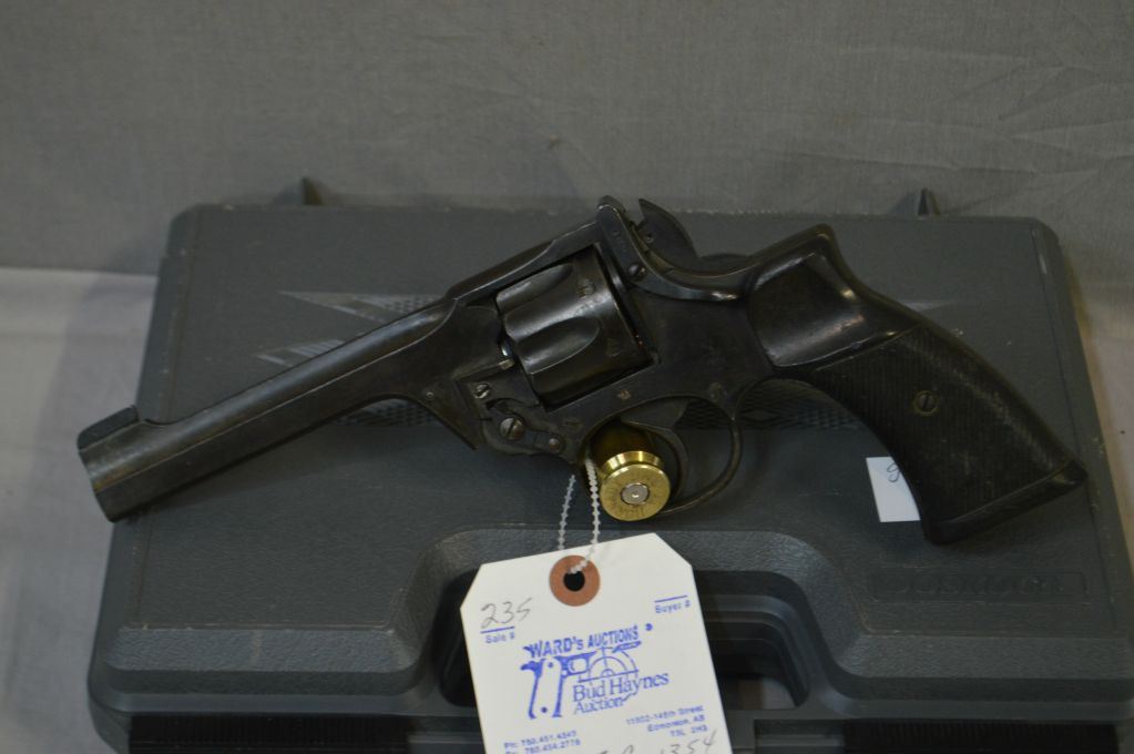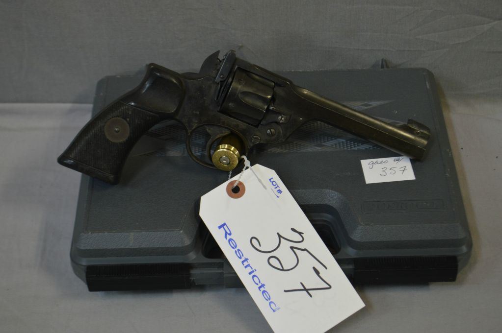 Enfield ( Royal Small Arms Factory , Enfield ) Model No 2 Mark I ** .38 S & W Cal 6 Shot Revolver w/ 127 mm bbl [ fading patchy blue finish, ED marked, no hammer spur ( Tanker ) , wooden grips, missing the lanyard ring, c/w grey foam lined plastic case ] Ser # ZG 1354 Restricted Handgun Cert # tci
