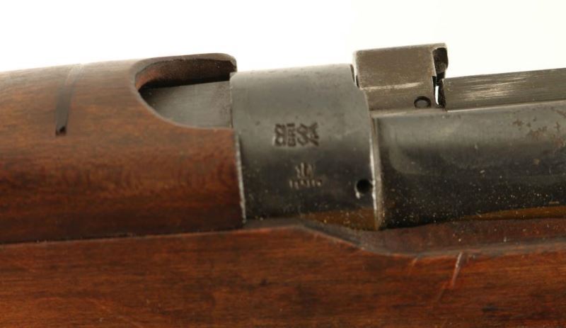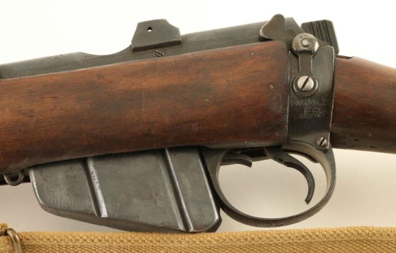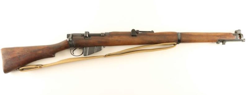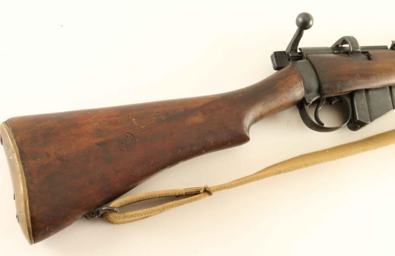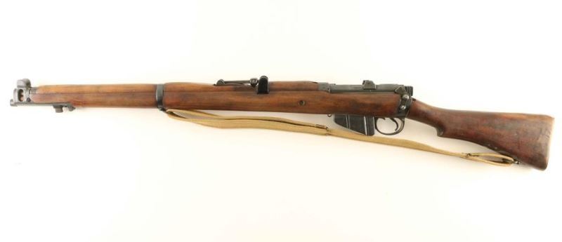Indian military magazine fed bolt action service rifle chambered in .303 British, manufactured circa 1946. Features a blued finish, 25.2" barrel, raised patridge front sight, leaf type rear sight graduated to 2000 yards, metal nosecap with bayonet lug & protective sight ears, single barrel band, serrated trigger, detachable 10 round magazine, manual safety on the left side of the receiver, canvas sling, charge loading bridge on the receiver, full length hand guard, forend, and straight grip shoulder stock with brass trapdoor buttplate. The left side of the butt socket is marked 'NO.1.Mk.III*/FR'46/ENGLAND." The stock is stamped with two circular cartouches, "JQD" & " S[broad arrow]A and is also stamped "S" on the underside of the wrist. And the receiver show a Birmingham proof house mark. Serial numbers match on the receiver, rear sight and nose cap. Rifle exhibits approximately 90% of its blued finish showing light wear and some scattered surface rust. Action is smooth, the bore is pristine and the wood stocks are near fine with a somewhat ill-fitting buttplate. Condition is near NRA Very Good ***C&R Firearm*** From The John F Sukey Collection