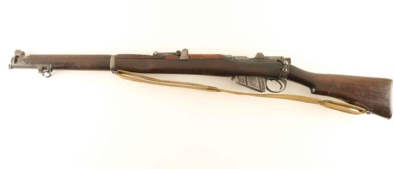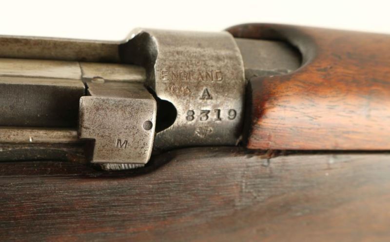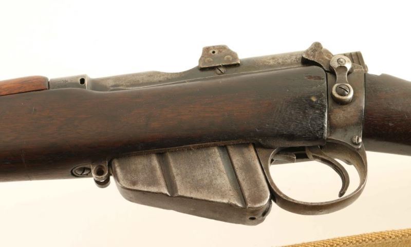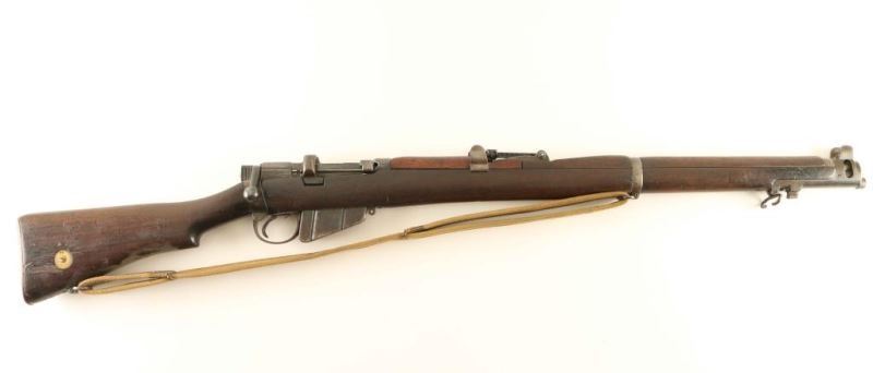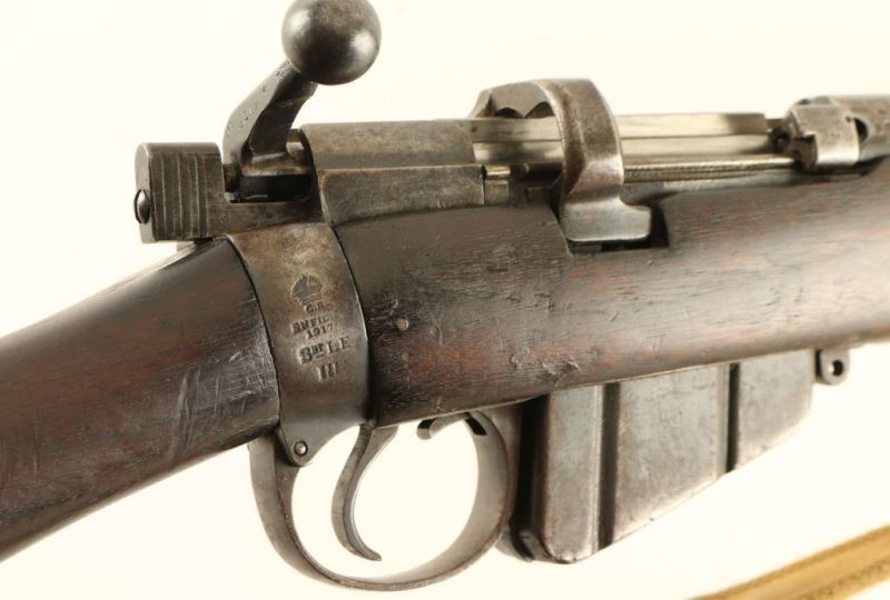 British military magazine fed bolt action service rifle chambered in .303 British. Manufactured circa 1917. Features a blued finish, 25.2" barrel, raised patridge front sight, leaf type rear sight graduated to 2000yds, metal nosecap with bayonet lug and protective sight ears, single barrel band, serrated trigger, detachable 10Rd magazine, manual safety on the left side of the receiver, canvas sling, charge loading bridge on the receiver, full length hand guard, forend, straight grip shoulder stock with brass disc and brass trapdoor buttplate containing oiler. The right side of the butt socket is marked '[crown]/G.R./ Enfield/1917 and SHT L.E/III*'. The receiver is stamped 'ENGLAND'. The stock is stamped '*K' on the underside of the wrist. The brass disc is stamped 'PW'. Serial numbers are matching on receiver, bolt handle and nosecap. Majority of the metal surfaces display a grey patina with approximately 15% of its bluing retained in the protected areas. Action is smooth, bore is dark with light rifling and the wood stocks are good+ with imperfections. Condition is near NRA Good ***C&R Firearm*** From The John F Sukey Collection