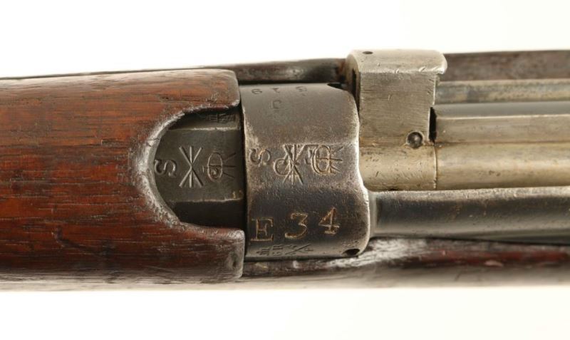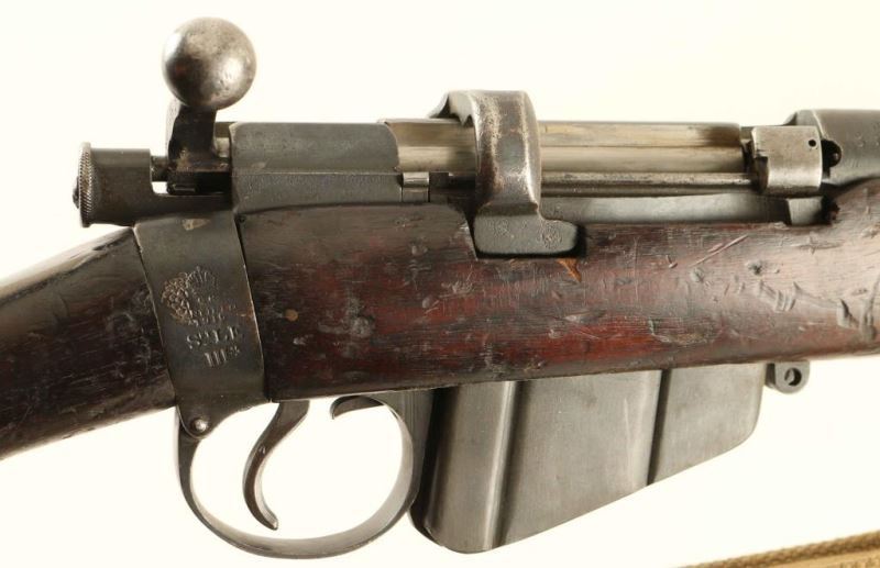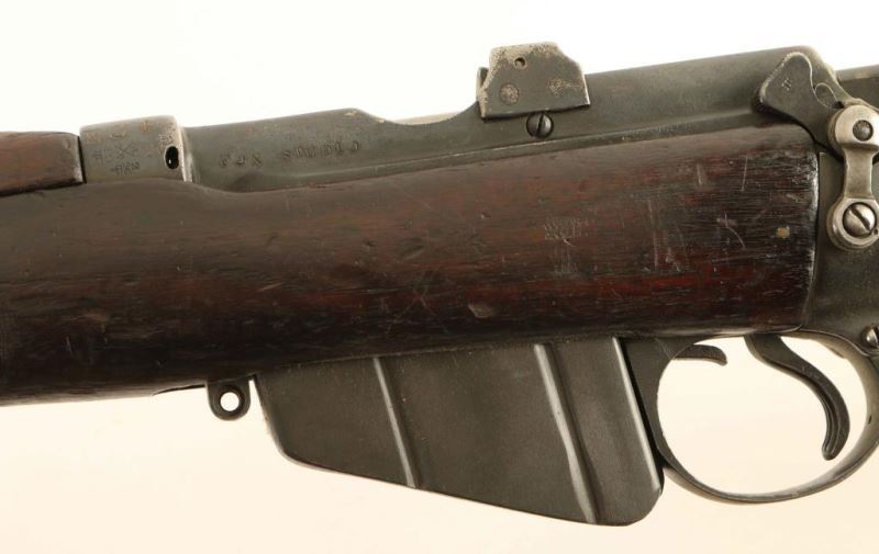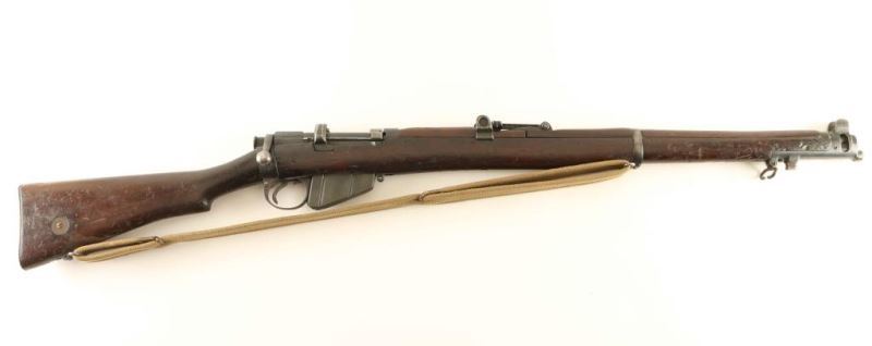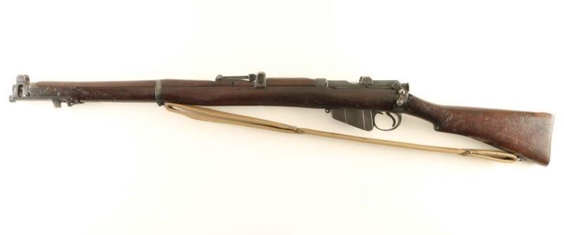 'FOX STUDIO' marked British military magazine fed bolt action service rifle chambered in .303 British. Manufactured circa 1916. Features a blued finish, 25.2" barrel, raised patridge front sight, leaf type rear sight graduated to 2000yds, metal nosecap with bayonet lug and protective sight ears, single barrel band, serrated trigger, detachable 10Rd magazine, manual safety on the left side of the receiver, canvas sling, charge loading bridge on the receiver, full length hand guard, forend, straight grip shoulder stock with brass disc and brass trapdoor buttplate. The right side of the butt socket is marked '[crown]/G.R./ Enfield/1916 and SHT L.E/III*'. Receiver is stamped 'E, 34, EY, DP, S and Fox Studio'. Barrel is marked 'HB' behind the rear sight and 'S/[broad arrows]/RR' above the chamber and the stock is marked 'M' on the butt. Rifle exhibits approximately 70% of its blued finish with pitting observed under the finish on the receiver. Action is mechanically sound, bore has good luster and rifling with a small amount of scattered surface rust and the wood stocks are good with a crack in the forend forward of the rear sight and numerous blemishes. Condition is NRA Good ***C&R Firearm*** From The John F Sukey Collection