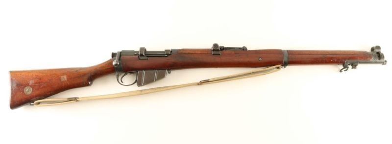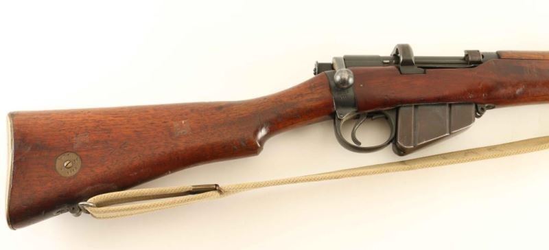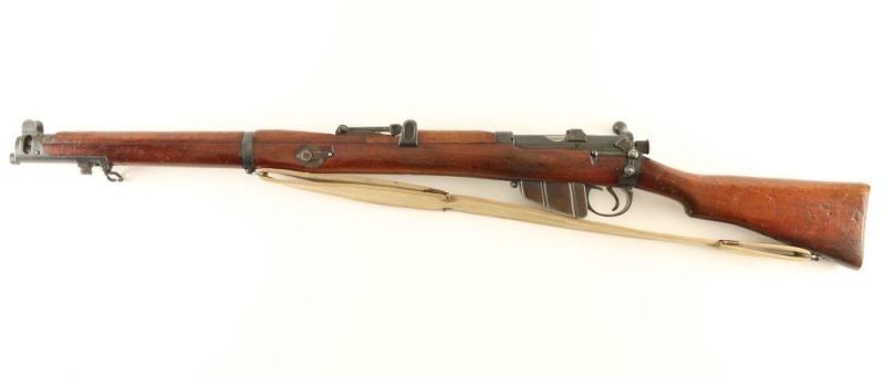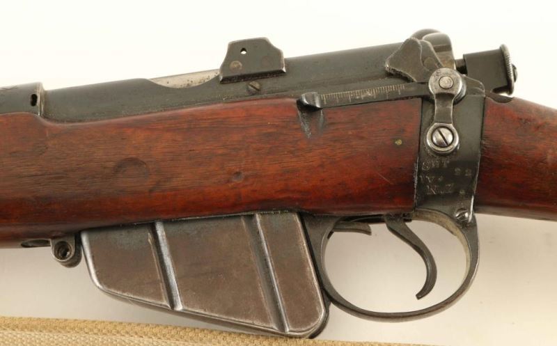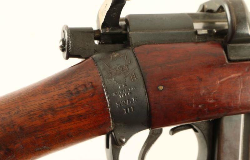 New Zealand marked British military single shot bolt action training rifle chambered in .22 caliber rimfire. Features a blued finish, 25.2" barrel, raised patridge front sight, leaf style rear sight graduated to 2,000 yards, volley sights, metal nose cap with protective sight ears, bayonet lug & piling swivel, serrated trigger, "22" marked 'magazine' that acts as a brass collector, manual safety on the left side of the receiver, tan canvas sling, integral charge loading bridge on the receiver, smooth full-length wood handguard & forend and straight grip shoulder stock with brass trapdoor buttplate containing an oiler. The right side of the butt socket is marked '"N[broad arrow]Z/5292(lined out)/[crown]/E.R./ENFIELD/1909/Sht L.E/III" and the left side of the butt socket is marked "Sht/22/IV*/N.Z." The bolt head is stamped ".22 No2" and the stock disc is marked "N[broad arrow]Z/5 28/2905." Serial numbers match on the receiver, barrel, bolt handle, and nose cap. Rifle retains approximately 85% of it's blued finish showing some light surface rust and mild wear with brown patina making up the balance. Action is smooth, the bore is good with some light pitting near the muzzle and the wood stocks are good with many blemishes. Condition is NRA Good++. ***C&R Firearm*** From The John F Sukey Collection