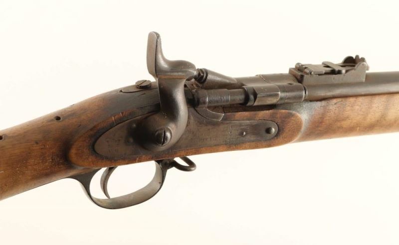 ***Unsafe to Fire*** British military single shot rifle features side hinged breech block, external hammer with lock plate, 36" barrel, blade front sight, "V" notch rear sight with flip up elevator ladder, sling swivels. Bore is poor condition, showing a light coat of rust and some visible rifling remaining. Metal surfaces are mostly patina brown color, with brighter colored thin rust in many places. Wood stock appears sanded, with loose bands, no finish, darker color staining in dents. Front edge of breech block has been ground and will not properly support a cartridge - cannot be fired safely. Brass buttplate has large round knob protruding rearward from toe. Markings include Enfield cartouche on right of butt, "II*" on top of receiver, "1862 ENFIELD" and "(crown)/(arrow)" on lock plate. Condition is NRA Poor (DO NOT ATTEMPT TO FIRE) *** Antique Firearm ***