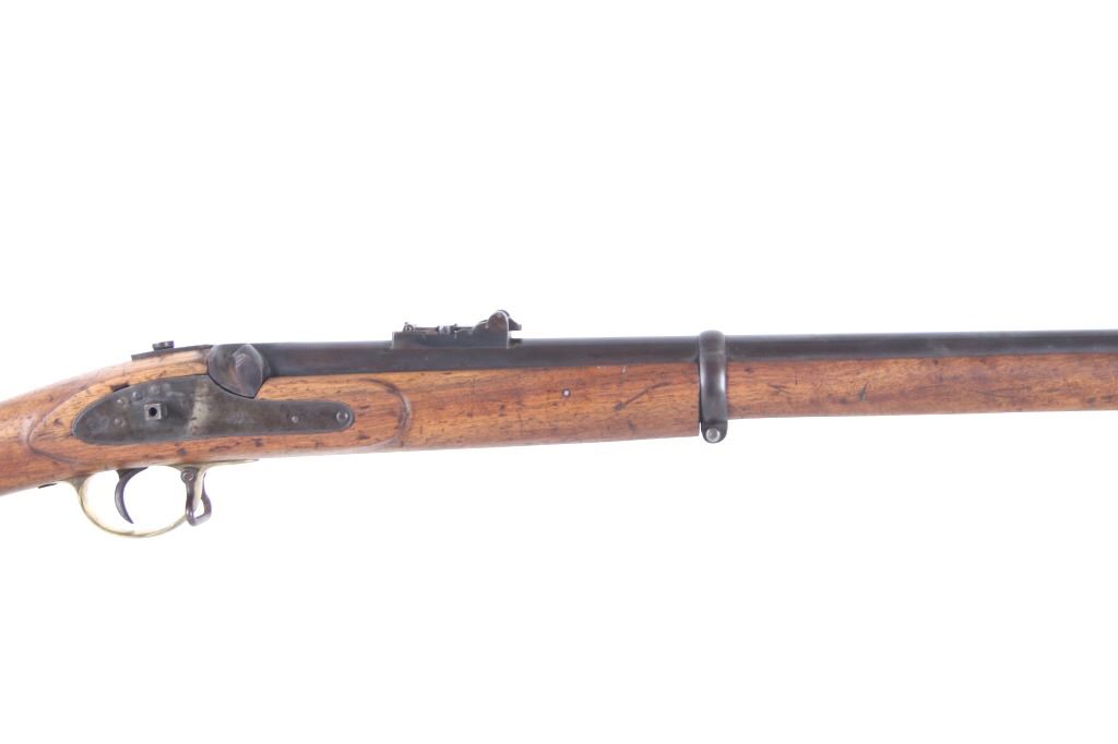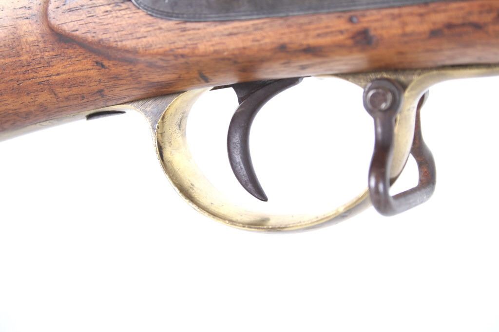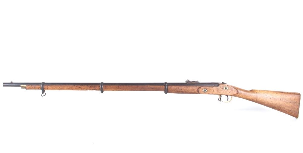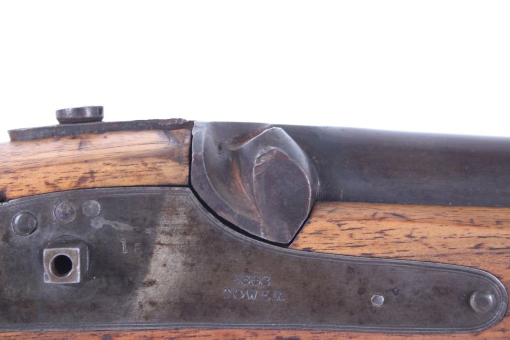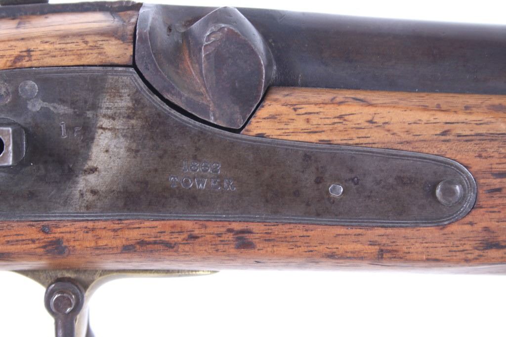 Featured in this lot we have an Enfield model 1862 Tower percussion cap rifled musket chambered in .58 caliber. The rifle displays a 38 1/2" round barrel, walnut stock, adjustable rear sight, brass butt plate and trigger guard, lock plate, and blue'd finish. The Tower British .58 caliber rifled musket was ordered by the thousands and delivered mainly to the Confederacy during the Civil War. This finely made weapon saw wide spread use through the entire conflict. After the war, many of these Tower muskets were retained by the soldiers who were issued them and many of these went West with the thousands of Ex-Confederate soldiers who did not want to remain in the defeated South during Reconstruction. According to the book Arming The West: A Fresh New Look at the Guns that were Actually Carried on the Frontier, “Myth-busting details from the Western shipping records of firearms giant Schuyler, Hartley & Graham, 1868-1886,” by noted arms historian Herbert G. Houze, beginning in 1868 and continuing through the 1870s, many thousand of these British .58 caliber Civil War surplus muskets were shipped to dealers and distributors in the West. They were considered reliable, powerful and accurate arms for economy minded westward pioneers. It also helped that many if not most men going West during this time had military experience and were familiar with the workings of the .58 caliber rifled musket. The lock plate is marked with "1862 Tower" with a stamped crown design. The lockplate shows good condition with the hammer missing. The barrel is stamped "24 24" with import and manufacture marks. The piece shows fair condition overall with wear due to age and use with the hammer and ram rod missing. No Serial Number. This firearm qualifies as an Antique, and does not require FFL Transfer or NICS Background Check.