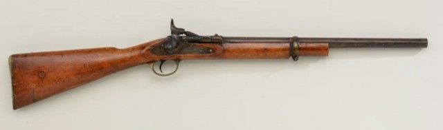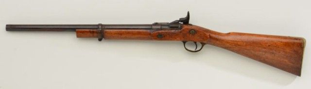 Enfield breech loading single shot carbine, .577 cal., 19” round barrel, brass trigger guard and butt plate, wood stock, #NVSN. This gun is in overall fair condition with a dark bore, crisp action, proofs, brown patina onmetal surfaces with coating of varnish on parts, wood stock is good with cut front end, cartouche on right side of butt stock and “D.C.” in diamond border on left side of butt stock; from an estate of a collector ofCanadian military and police items. Est.: $300-$500.