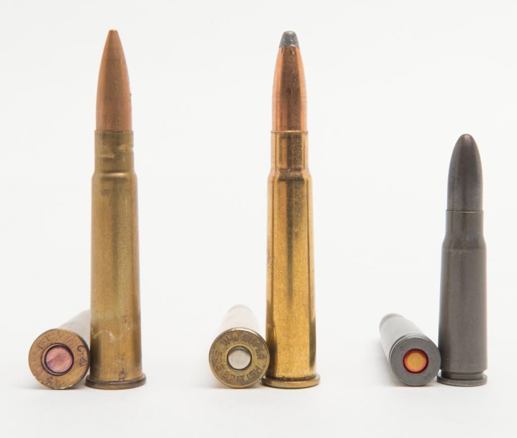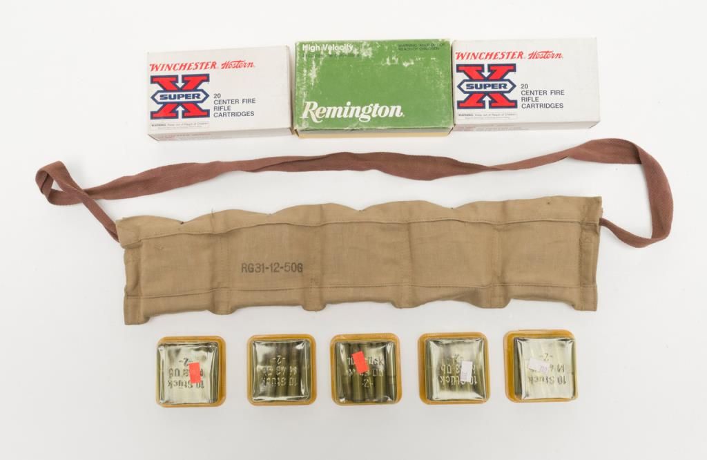 Enfield shooters lot consisting of 60 rounds of commercially loaded .303 British and another 40 rounds of military ammo slung on a cloth bandoleer for 100 rounds total. Additionally, 50 rounds of 7.62 x 39 in 10 round blister packs. A shooterslot. Est.: $50-$100.