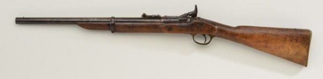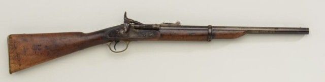 Enfield single shot breech loading rifle in the pattern of an 1861 Cavalry carbine, .577 cal., 19” round barrel, wood stock, #NVSN. This gun is in well-worn condition showing a brown patina on metal surfaces, with proofs,scattered old mars and dings from carry and storage, good action, rough bore, good wood stock with cartouche on right side of stock and “4 16 5 1867” stamped on either side of the cartouche; brass trigger guard andbutt plate that is marked “62 125”. From the estate of a collector of Canadian military and police materials. Est.: $300-$500.