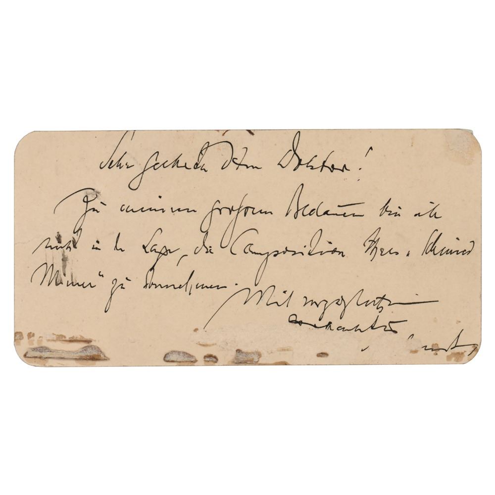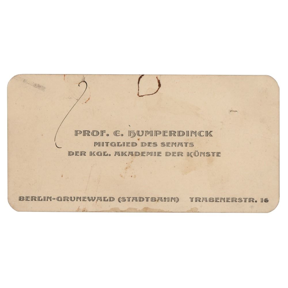 German Romantic composer (1854-1921) best known for the opera Hansel und Gretel. Unsigned handwritten note in German by Engelbert Humperdinck on the reverse of a 4.25 x 2 card imprinted with his name and title. In very good condition, with some surface loss and mounting remnants to edges.