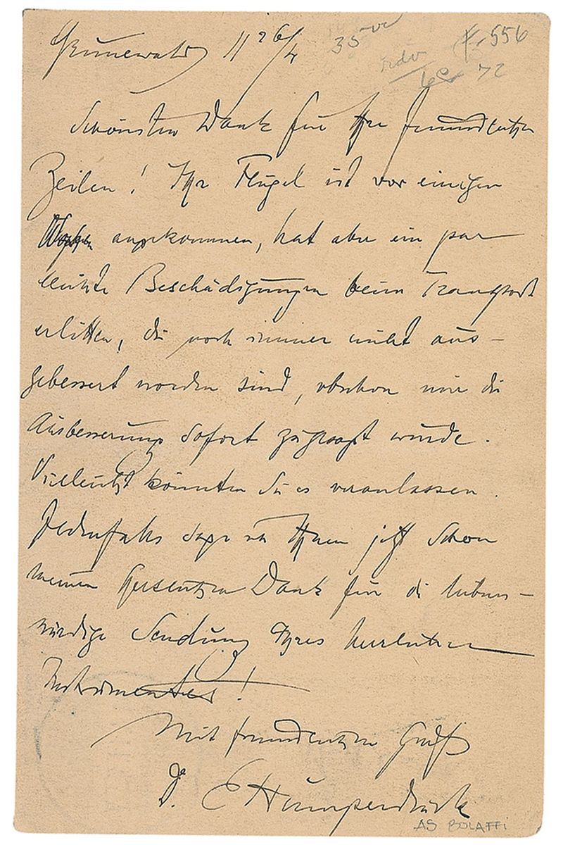 German Romantic composer (1854–1921) best known for the opera Hänsel und Gretel. He is not related to the 1960s British pop star of the same name (born Arnold Dorsey), who ‘borrowed’ the composer’s moniker from a music dictionary. ALS in German, signed “E. Humperdinck,” on a 3.5 x 5.5 postcard, November 26, 1904. Untranslated letter to Berthold Neuer in New York. In very good to fine condition, with a light central horizontal crease, a uniform shade of mild toning, small pencil notations to top and bottom edges, and slight show-through from postmark on reverse.