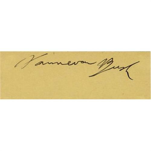 <B>Engineer Vannevar Bush Signature</B></I> on card 5.5" x 2", mounted on stiff card stock with a brief biographical sketch. Bush (1890-1974) was an American engineer and science administrator, known for his work on analog computing, his political role in the development of the atomic bomb, and the idea of the memex-seen as a pioneering concept for the World Wide Web. A leading figure in the development of the military-industrial complex and the military funding of science in the United States, Bush was a prominent policymaker and public intellectual ("the patron saint of American science") during World War II and the ensuing Cold War. Through his public career, Bush was a proponent of democratic technocracy and of the centrality of technological innovation and entrepreneurship for both economic and geopolitical security. In 1922, Bush and his college roommate, Laurence K. Marshall, set up the American Appliance Company to market a device called the S-tube. This was a gaseous rectifier invented by C. G. Smith that greatly improved the efficiency of radios. Bush made a lot of money from the venture. Eventually the name was changed to Raytheon, an electronics giant and defense contractor. Very fine.<BR><BR><b>Shipping:</b> Flat Material, Small (<a target="_blank" href="http://www.heritageauctions.com/common/shipping.php">view shipping information</a>)
