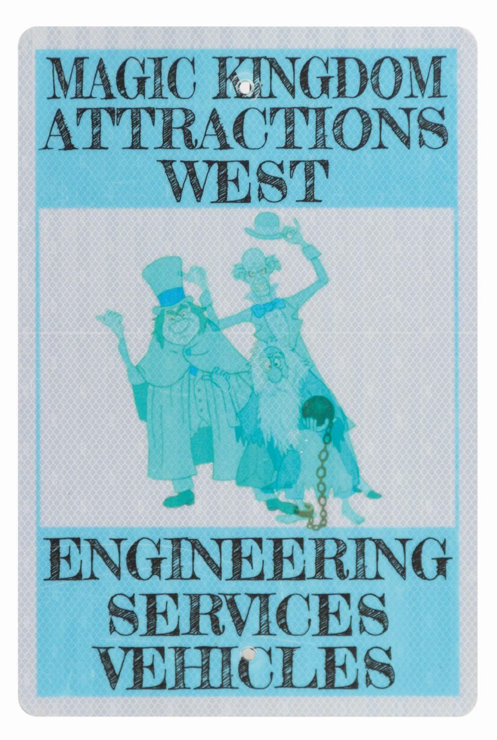 (Walt Disney World, 1990s-2010s) An original parking lot sign used to designate spaces for Engineering Services vehicles from the Magic Kingdom Attractions division handling the Western sector of the park. Comprised of a special reflective material over a metal core, the sign features a graphic of the Hitchhiking Ghosts as the Haunted Mansion is located in the Western portion of the Magic Kingdom. Measuring 18"x12", the sign is in very good condition, exhibiting only minor surface wear and weathering from outdoor use.