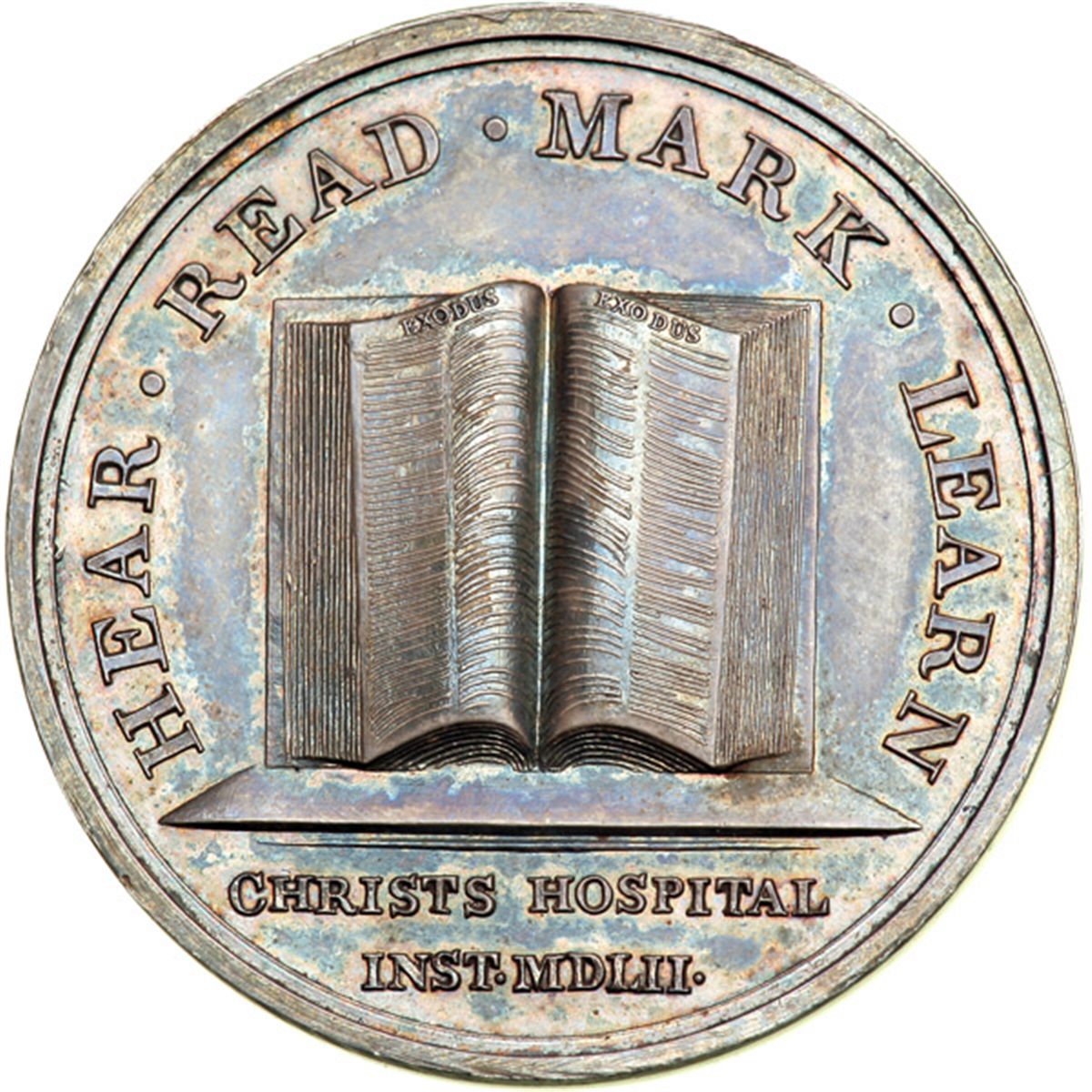 England. Christ's Hospital Medal, ND. Eimer-29. Silver 35 mm. by L. Pingo. Edge: John Thomas Smith 1845. Originally struck c.1790 and awarded in silver up to c.1890. Obverse: Edward VI, bust right, crowned and draped. Reverse: An open bible. Nicely toned. NGC graded MS-63.