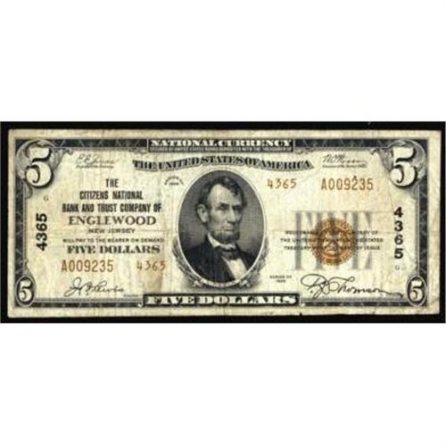 Englewood, NJ. $5 1929 Ty. 2. The Citizens NB and TC. Charter #4365. Fine.
