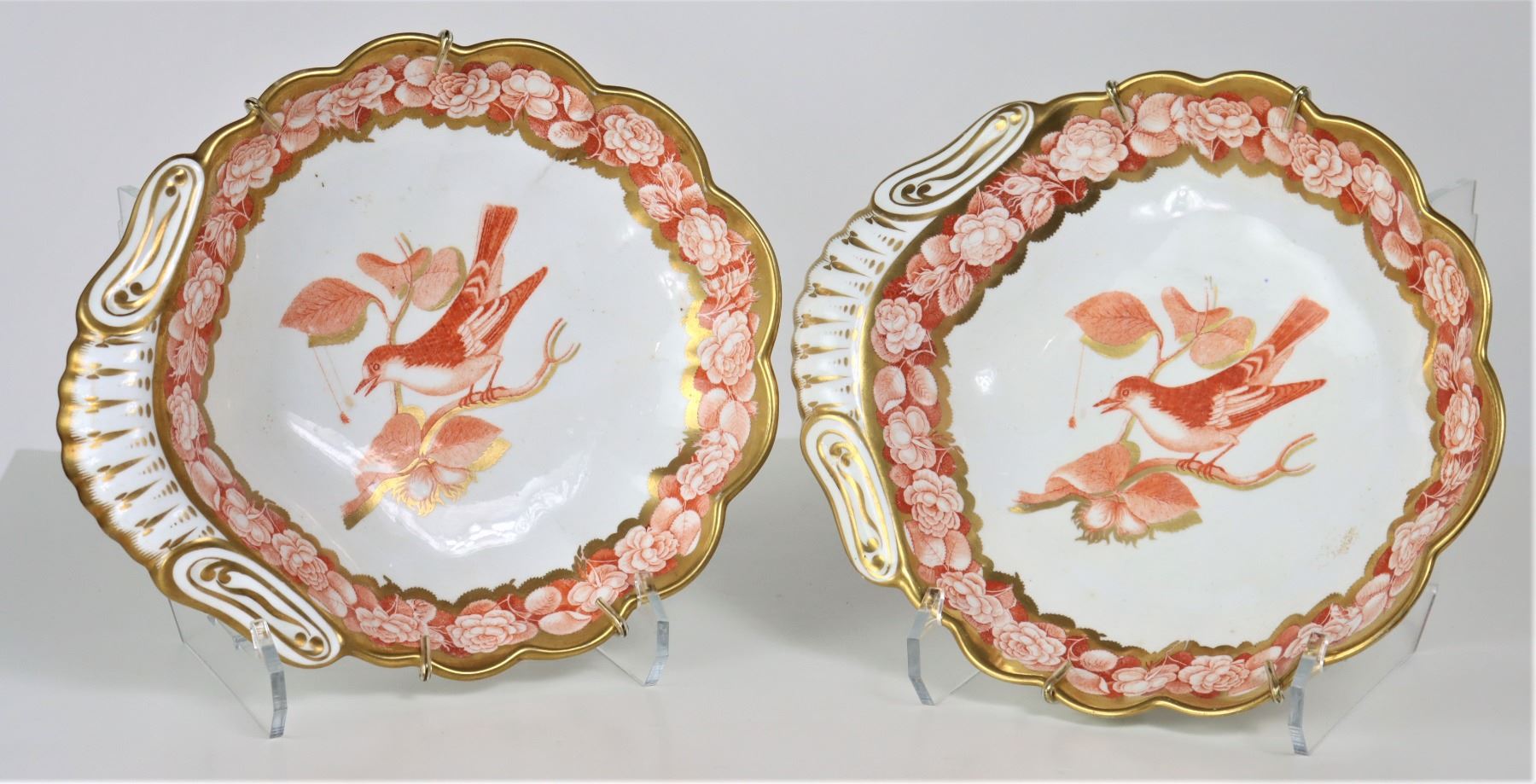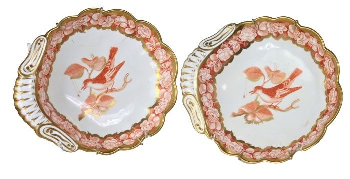 English 19th C, possibly coalport orange and gilt scalloped dishes with floral board and sacred bird. Ca. 1830.