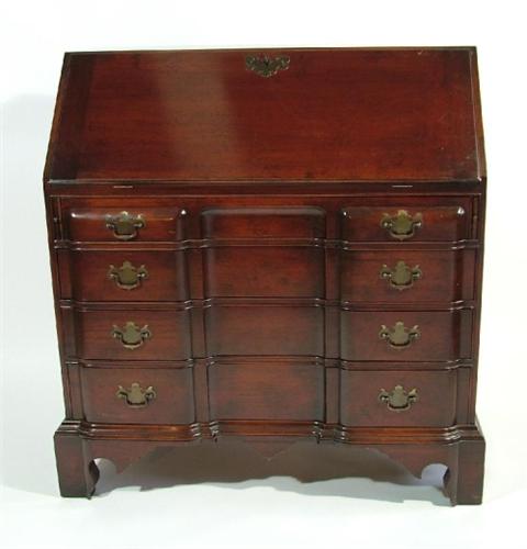 (England 19th Century) Mahogany interior has letter compartments and eleven small drawers. In the bottom of the desk there are four large drawers. 34 1/4' by 41" by 22 1/2".