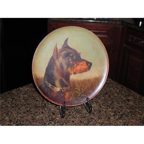 English 19th Century Oil Painted Dog Plaque. This appears to be a Doberman painted on a Terracotta Plaque. Diameter is 12 1/2 inches. There are some scratches, but this does not detract from the beauty of the piece. on the back of the plaque is one small chip(shown in photo) and a number embossed in the plaque.