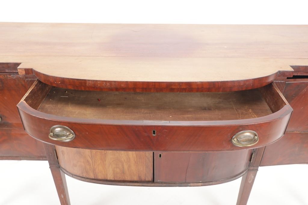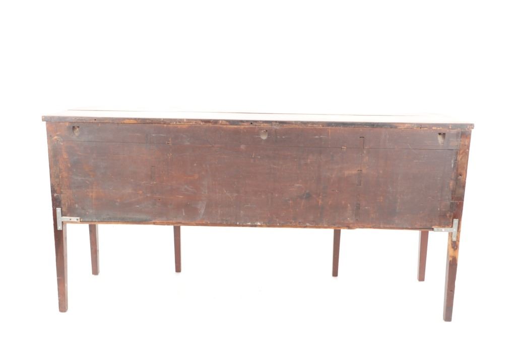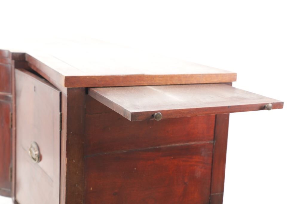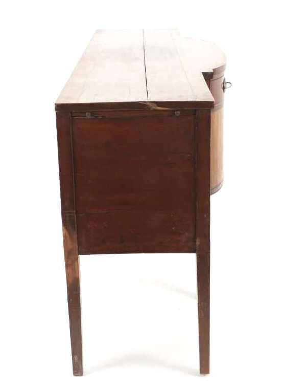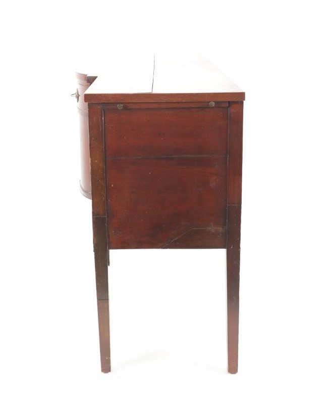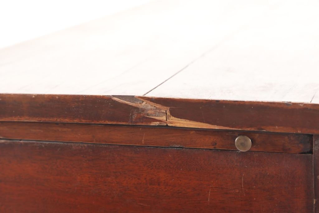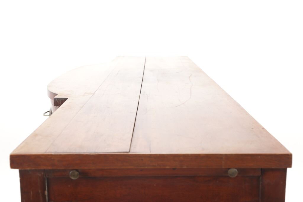 Featured in this lot is this English 4 drawer mid-century Sheraton Bureau table. The table features a wonderfully and professionally crafted hardwood stained mahogany construction that shows a large platform table top with two side cabinet compartments and a top sliding cabinet drawer with a large compartment in the center. The legs are reinforced with right angle supports denoting this piece to be from mid century. The condition of this Bureau Desk is preserved with one of the top panels come loose and some wear due to age and use with some of the drawer handles missing but otherwise is in preserved condition. The measurements of this Bureau Desk is 37" x 72 5/8" x 23 7/8".