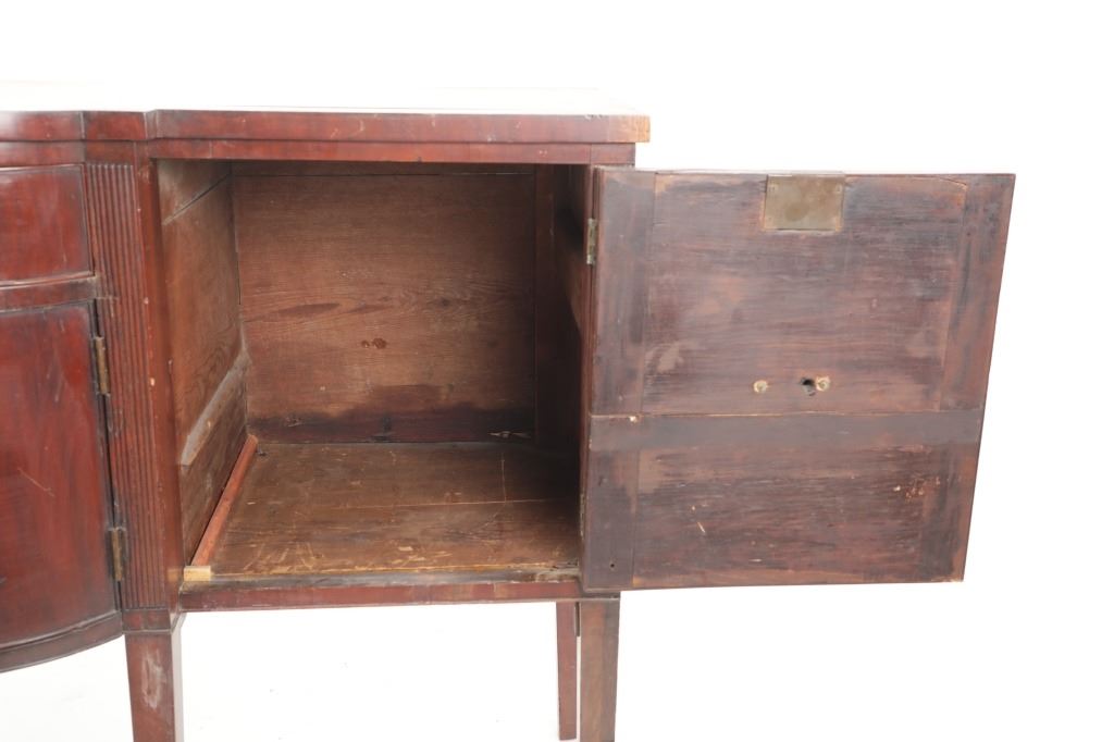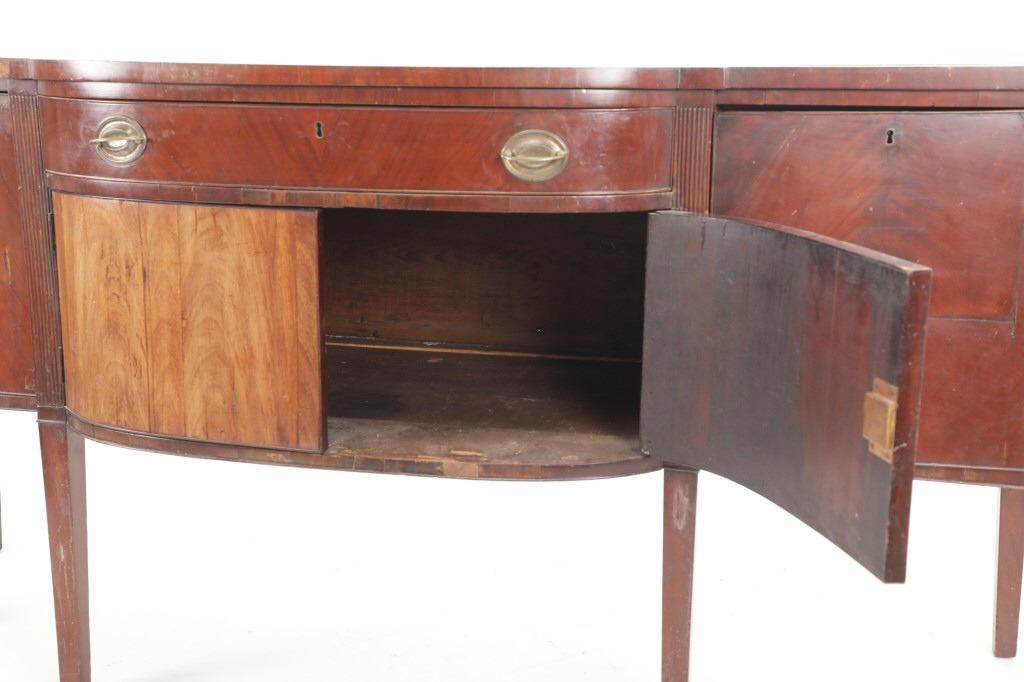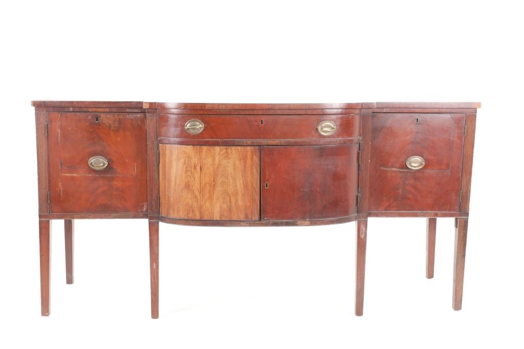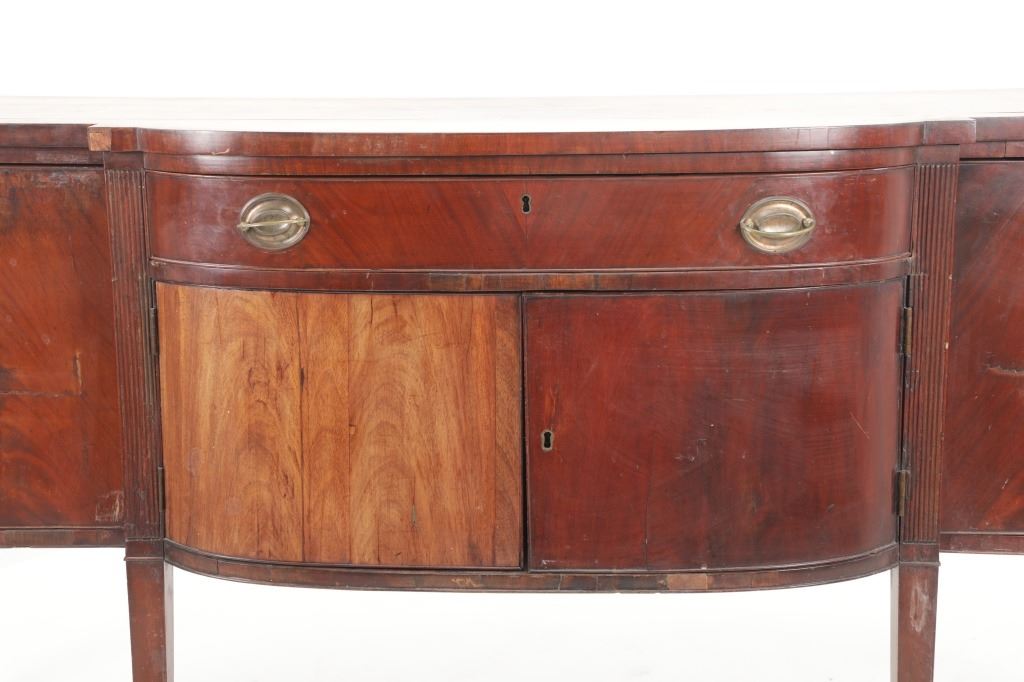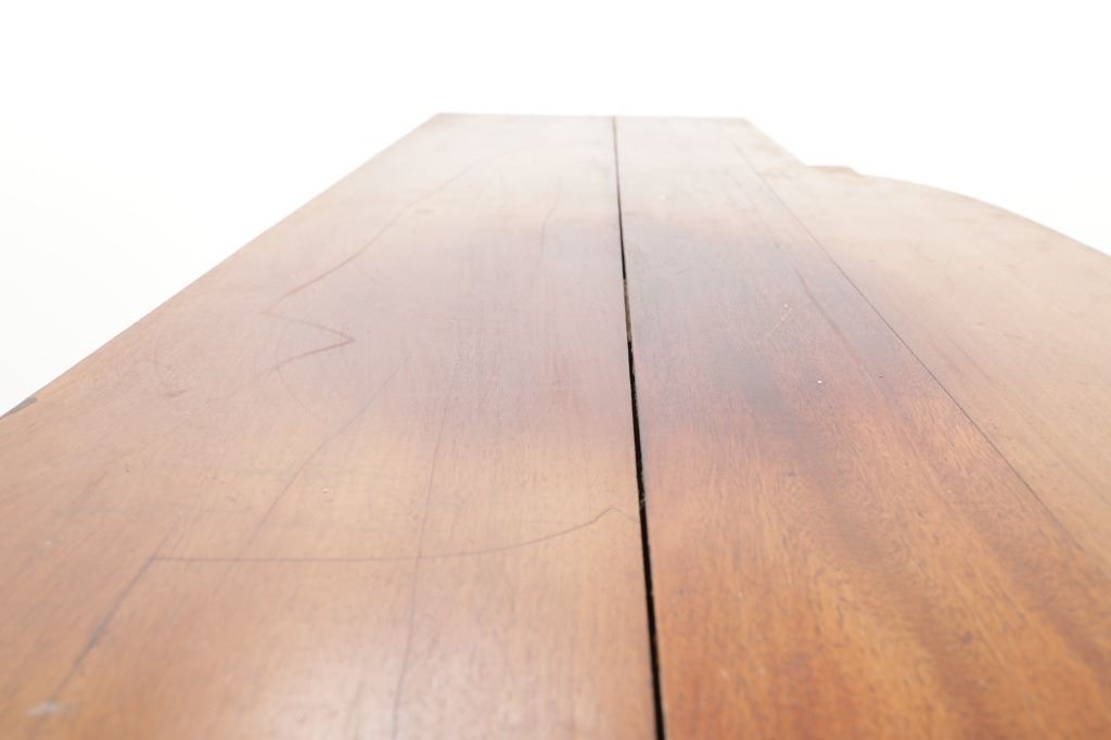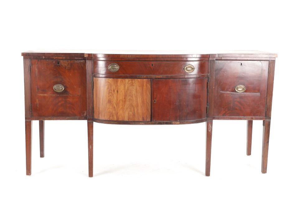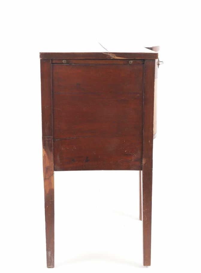 Featured in this lot is this English 4 drawer mid-century Sheraton Bureau table. The table features a wonderfully and professionally crafted hardwood stained mahogany construction that shows a large platform table top with two side cabinet compartments and a top sliding cabinet drawer with a large compartment in the center. The legs are reinforced with right angle supports denoting this piece to be from mid century. The condition of this Bureau Desk is preserved with one of the top panels come loose and some wear due to age and use with some of the drawer handles missing but otherwise is in preserved condition. The measurements of this Bureau Desk is 37" x 72 5/8" x 23 7/8".