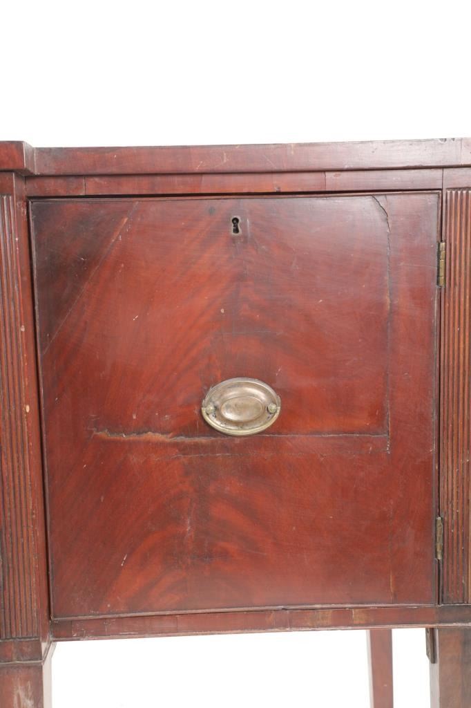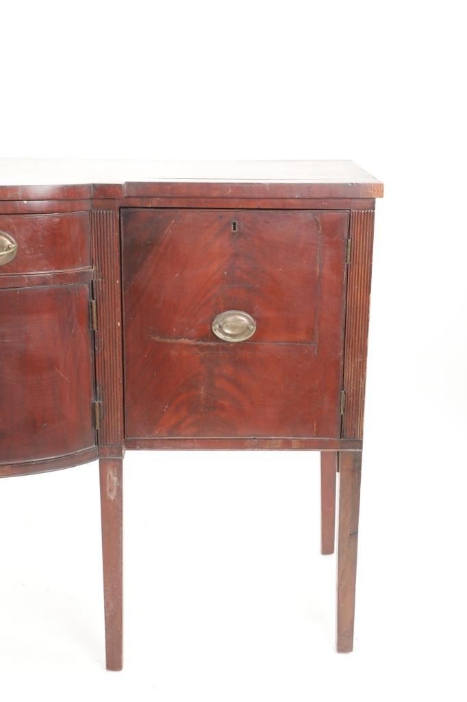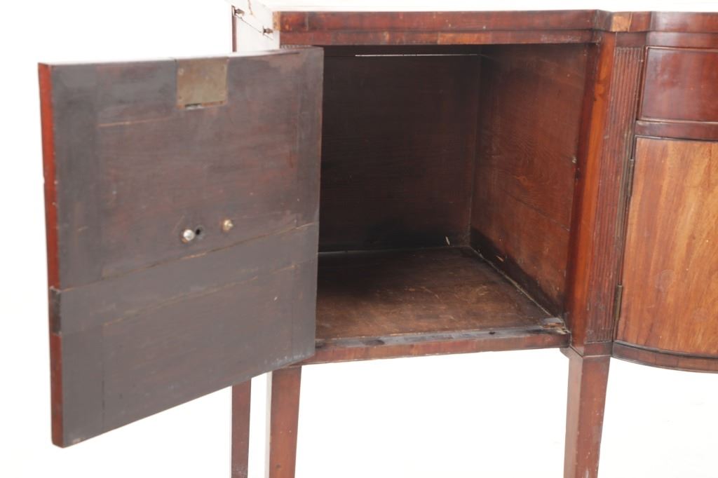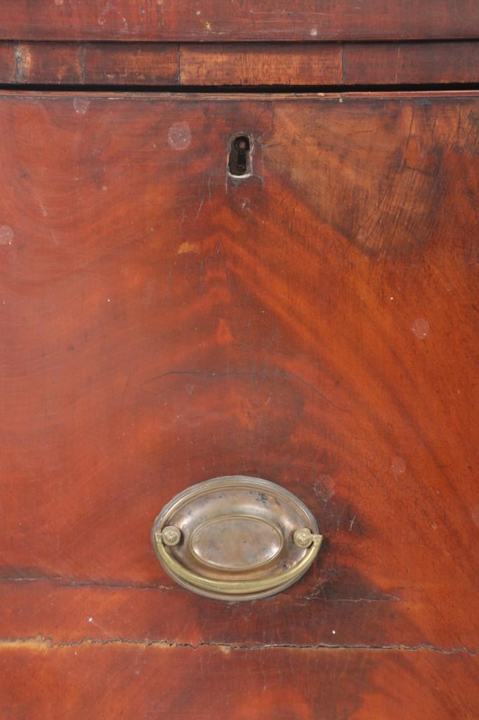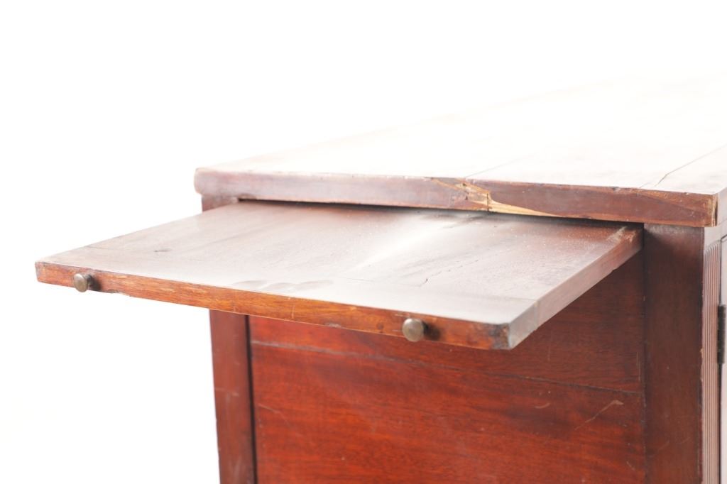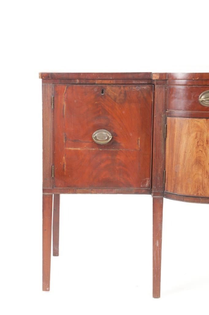 Featured in this lot is this English 4 drawer mid-century Sheraton Bureau table. The table features a wonderfully and professionally crafted hardwood stained mahogany construction that shows a large platform table top with two side cabinet compartments and a top sliding cabinet drawer with a large compartment in the center. The legs are reinforced with right angle supports denoting this piece to be from mid century. The condition of this Bureau Desk is preserved with one of the top panels come loose and some wear due to age and use with some of the drawer handles missing but otherwise is in preserved condition. The measurements of this Bureau Desk is 37" x 72 5/8" x 23 7/8".