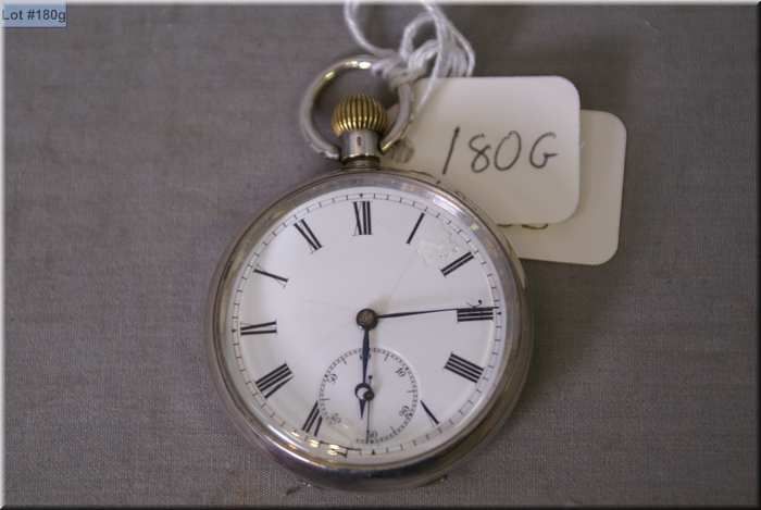 English .925 sterling silver size 14 C.K and Co., pinion set, open faced pocket watch in working ord