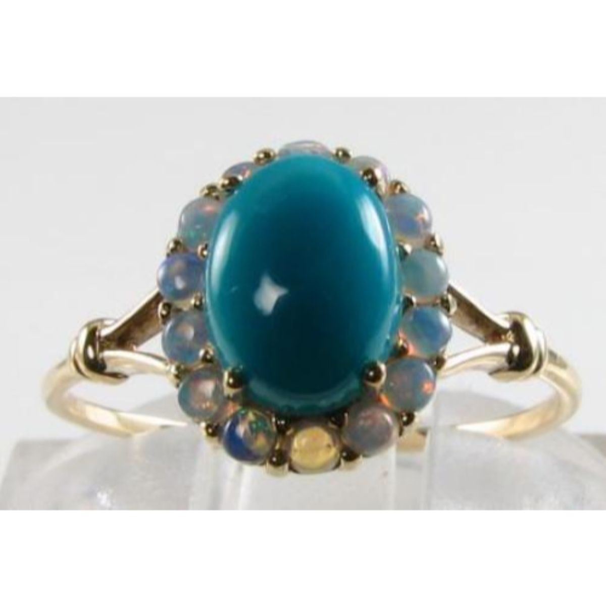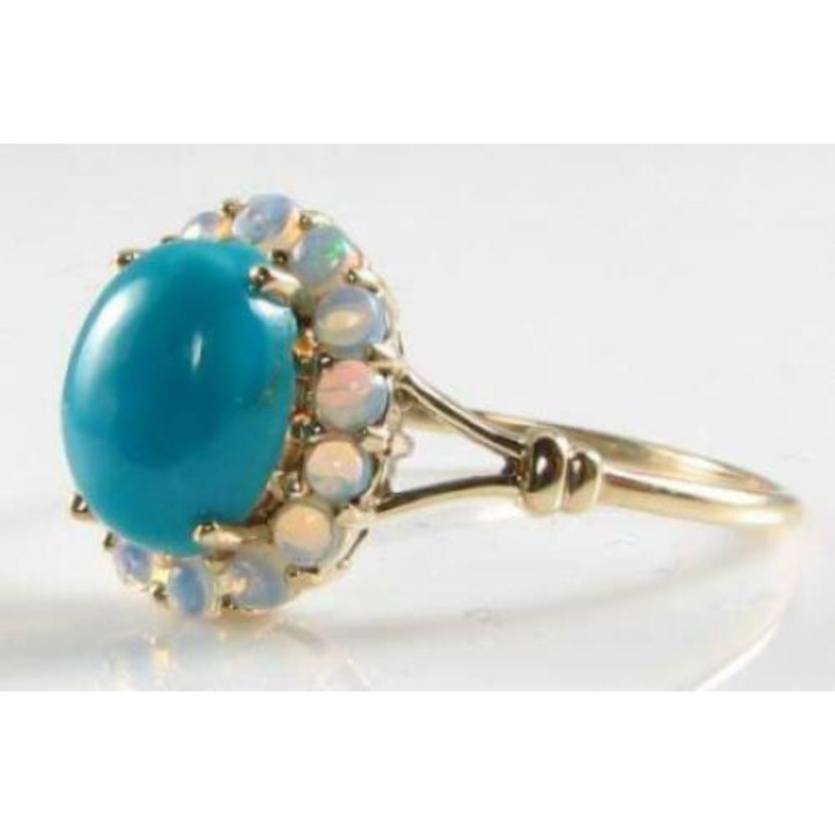 1.40 ct Persian Turquoise oval center stone ( 8mm X 6mm ) surrounded by .54ct Australian round Opals ( 10 total - 1.8mm size ) set in 9K yellow gold, delicate Victorian style cluster ring. English size O or US size 7.5. Face of ring - 19.5mm shoulder to shoulder. UK hallmarked gold ( 375 ).