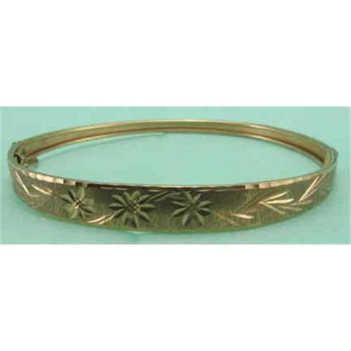 To fit a 7" wrist. 3/8" wide at the widest part. Marked "375" for 9k gold. English c1970. Lobster safety clasp. Pretty chased decoration.