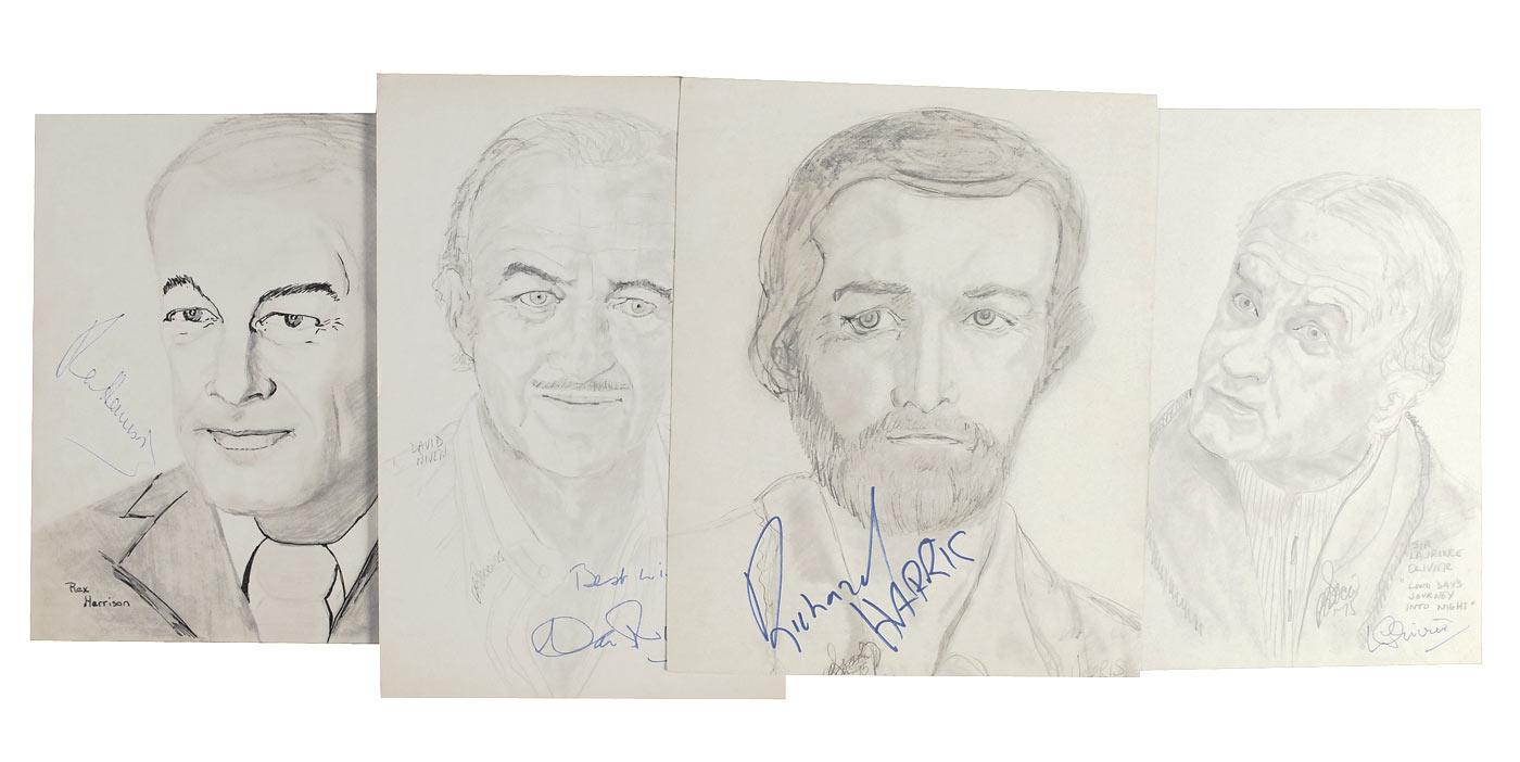 Four original pencil sketches, all done by an admirer, ranging in size from 7.25 x 9 to 8.25 x 10, each signed in ink or felt tip by the respective celebrity pictured. Signers are: Richard Harris, Rex Harrison, David Niven (adding “Best wishes”), and Laurence Olivier (signed “L. Olivier”). In fine overall condition with a few faint bends and creases.