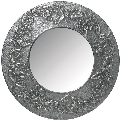Good English Arts & Crafts mirror, wood with hammered pewter overlay, nicely detailed decoration, original patina, 13.5"w, quite nice