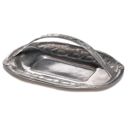 English Arts and Crafts handled tray, pewter with stylized leaf and berry designs, original patina, impressed marks,12in.x 4in.