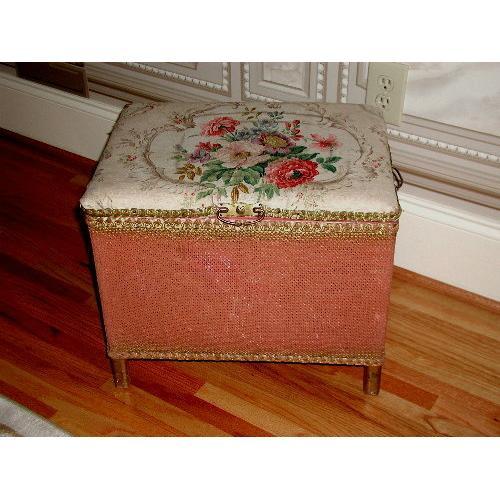Unique English hamper is made by the Lloyd Loom Company of London. Their signature gilt tones shading into the rose tone around the lid and bottom adjacent to the gilt heavy braid trim. Solid wood interior construction and feet makes this piece superb as a stool. Delicate brass handles with escutcheons on both sides and center. The hamper,bench is in excellent condition,however, the floral fabric is in good condition but does have a slightly darker mark in a square in the center. Can easily be changed as the top row of braid securing the material is attached with small nails. The interior is rose as well with cottom rope as hinge between top and bottom. Measures 19L X 13W X 16H.