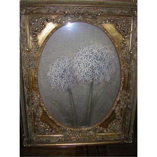 18 x 22 Ornate antique gold frame with purple flowers. Artist is Adams. Comes with heavy duty wall hanger.