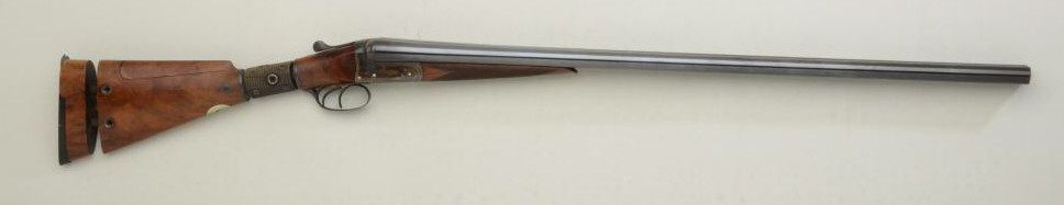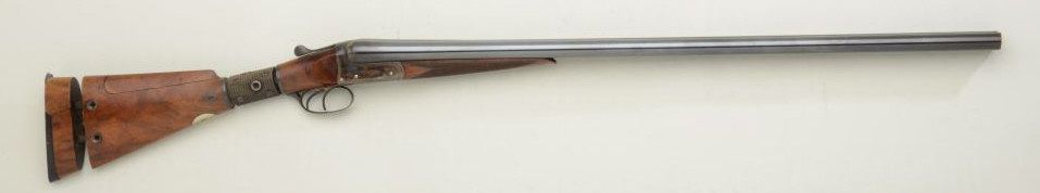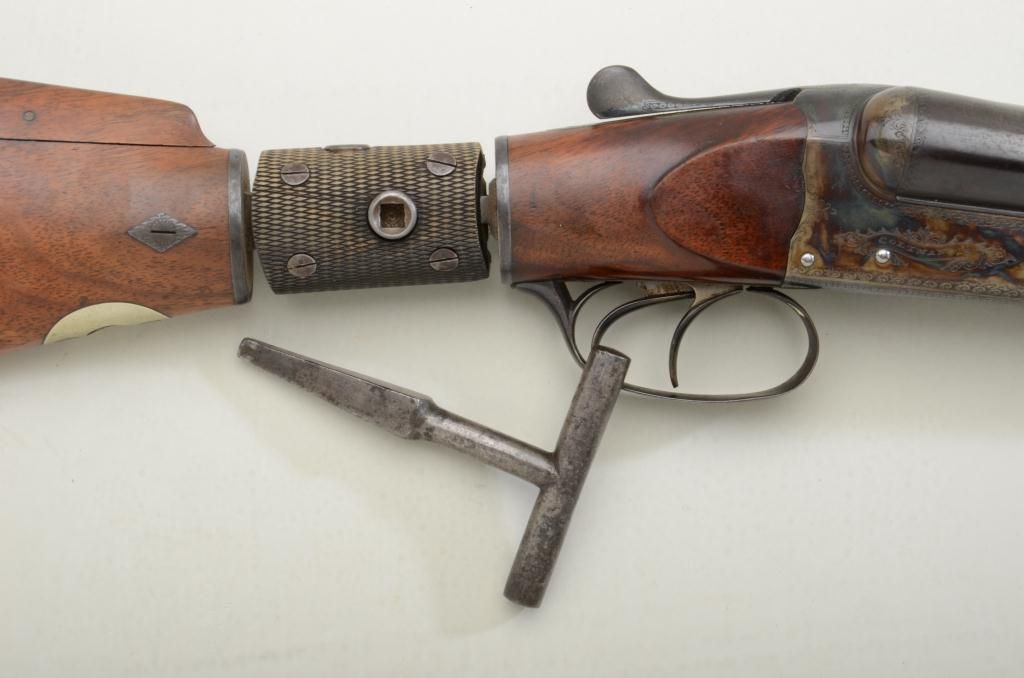 English Boxlock double barrel 12 gauge shotgun by Coltman & Co., addressed Burton on Trent, with articulated and adjustable stock or so-called "try-gun" used by manufacturers to fit customer to his shotgun. No serialnumber visible. The gun shows 29-3/4" barrels, tapered and non-ventilated rib, standard extractors, double triggers, blue and case hardened finish; nitro proofed for 2-1/2" shells, retaining 90-95% original blue and bright case hardening. Very good wood stocks, a key type device for adjusting the stock is included. The bores are fine to excellent, but the gun appears to have been shot a small amount, probably just testfiring. A good collector's item, but also useful for dealers to fit customers. We date the gun to approximately 1900-1920s. Note: This gun was used by Holland & Holland for many years at their manufacturing plant, asper experts at Ivory Beads, Covina, CA. Est.: $1,500-$3,000