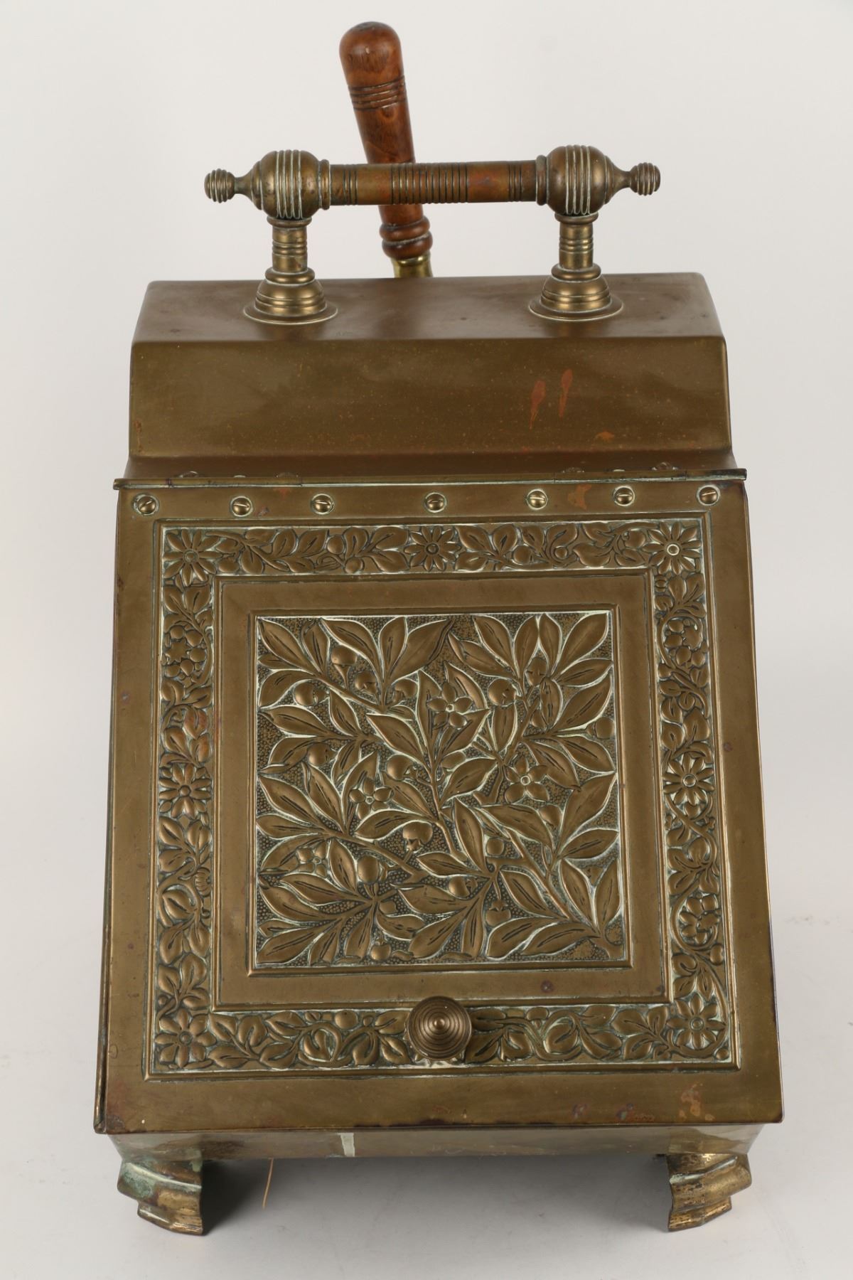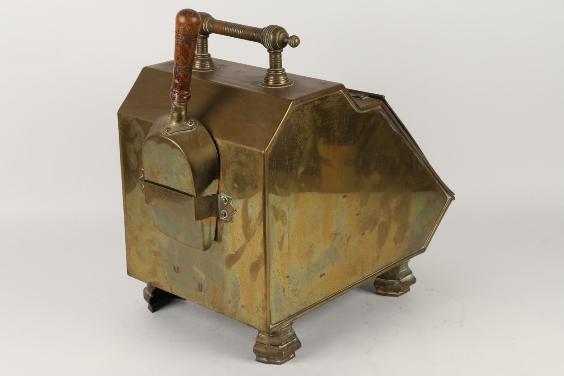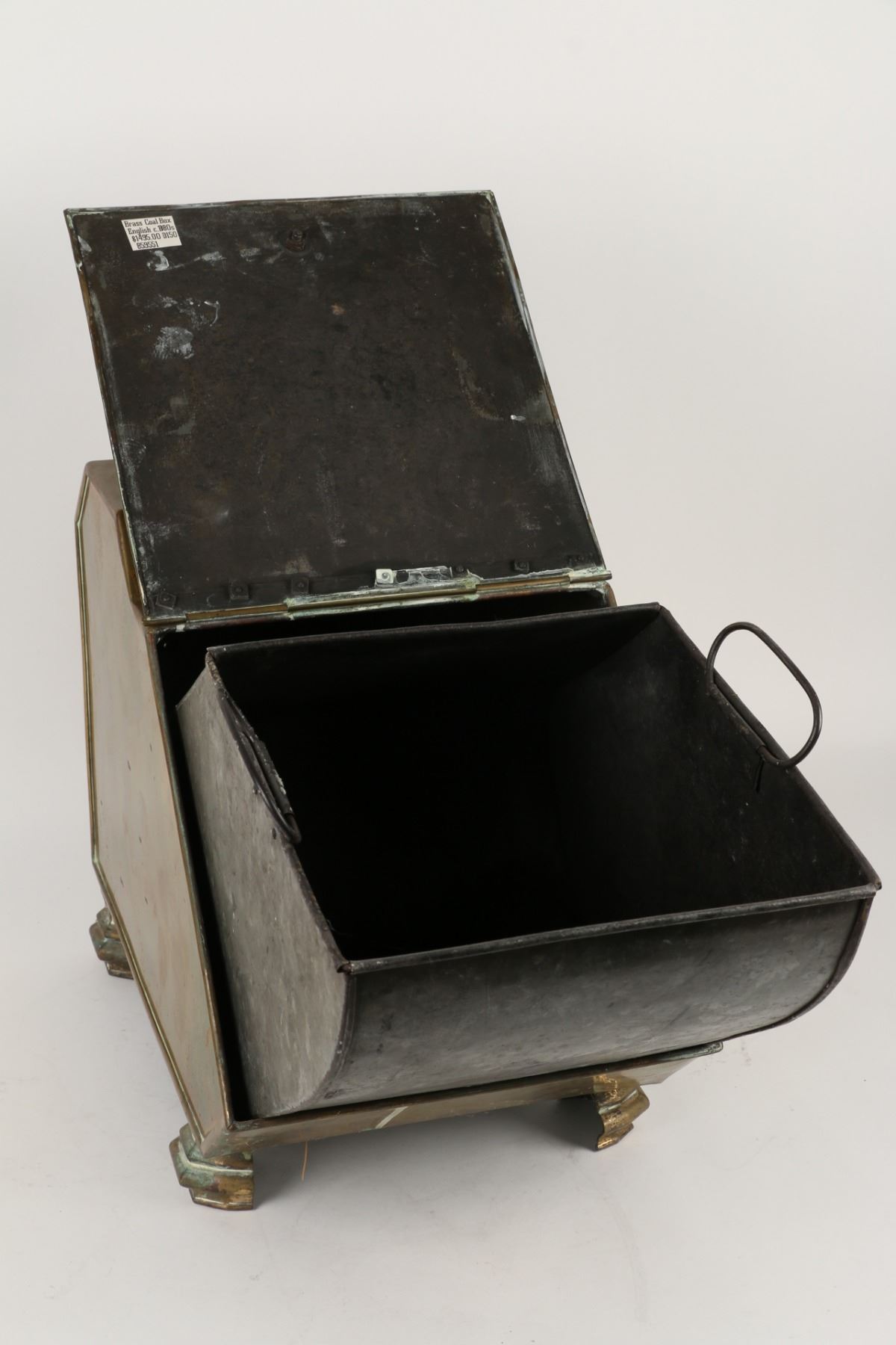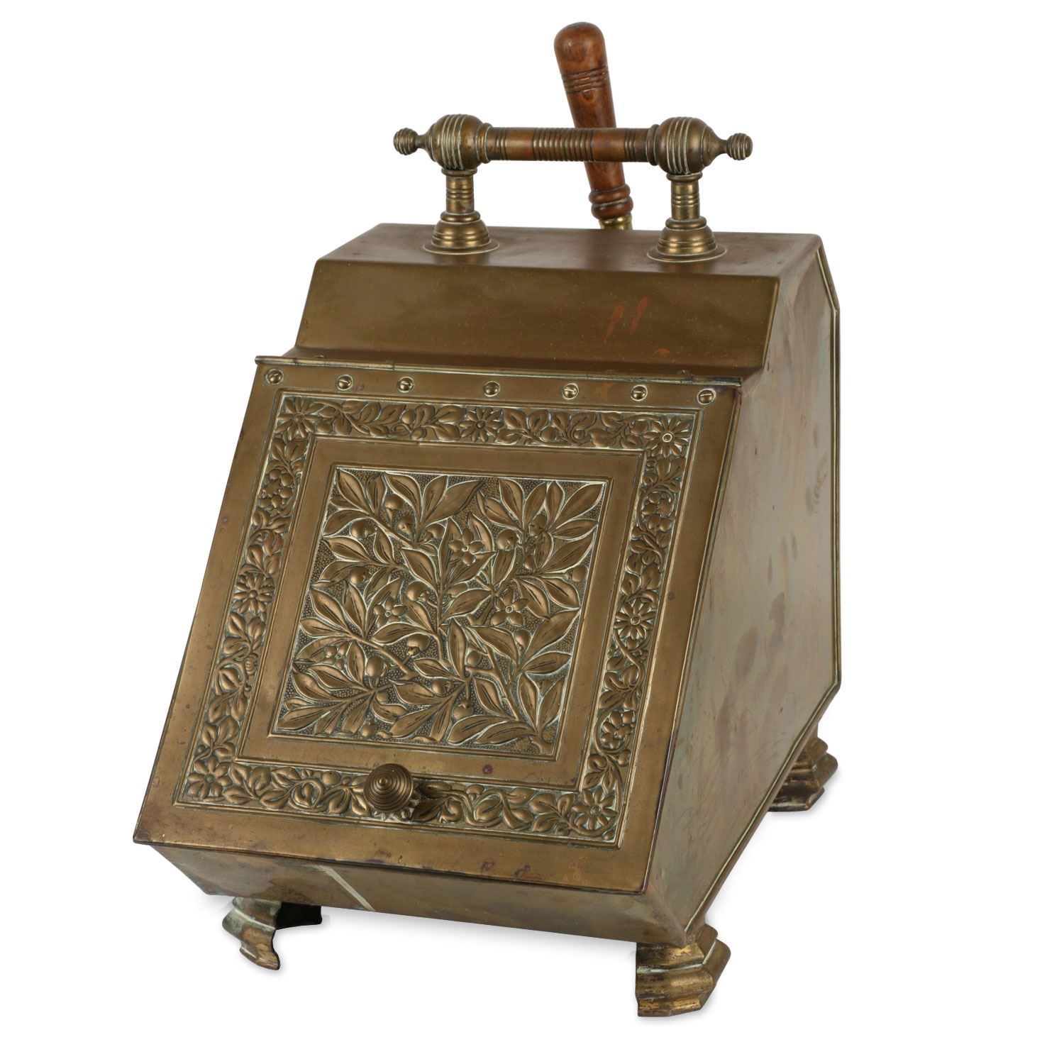 Lot 144 - Circa 1880s. Includes matching wood-handled brass scoop and tin insert. 17" x 11" x 19". $200-300.