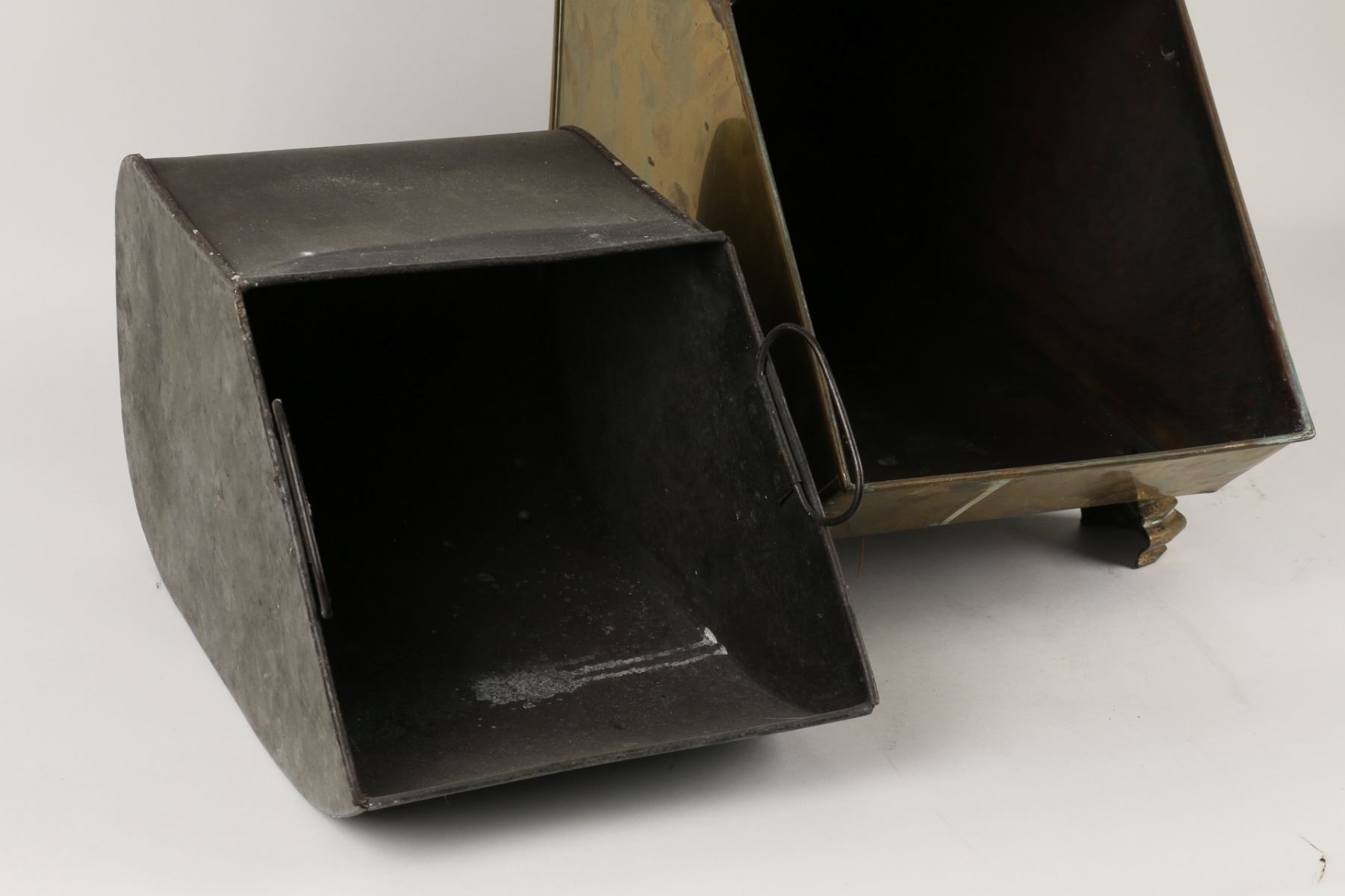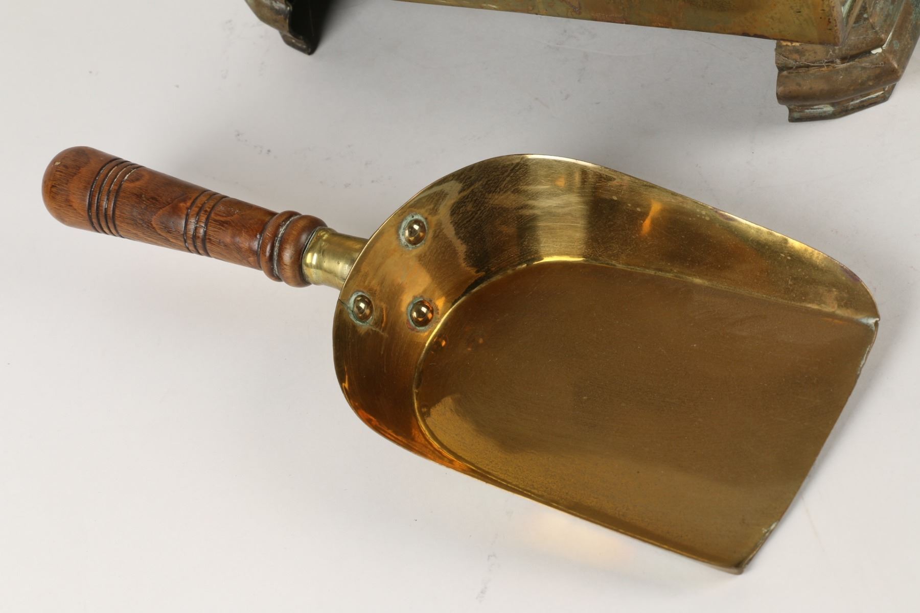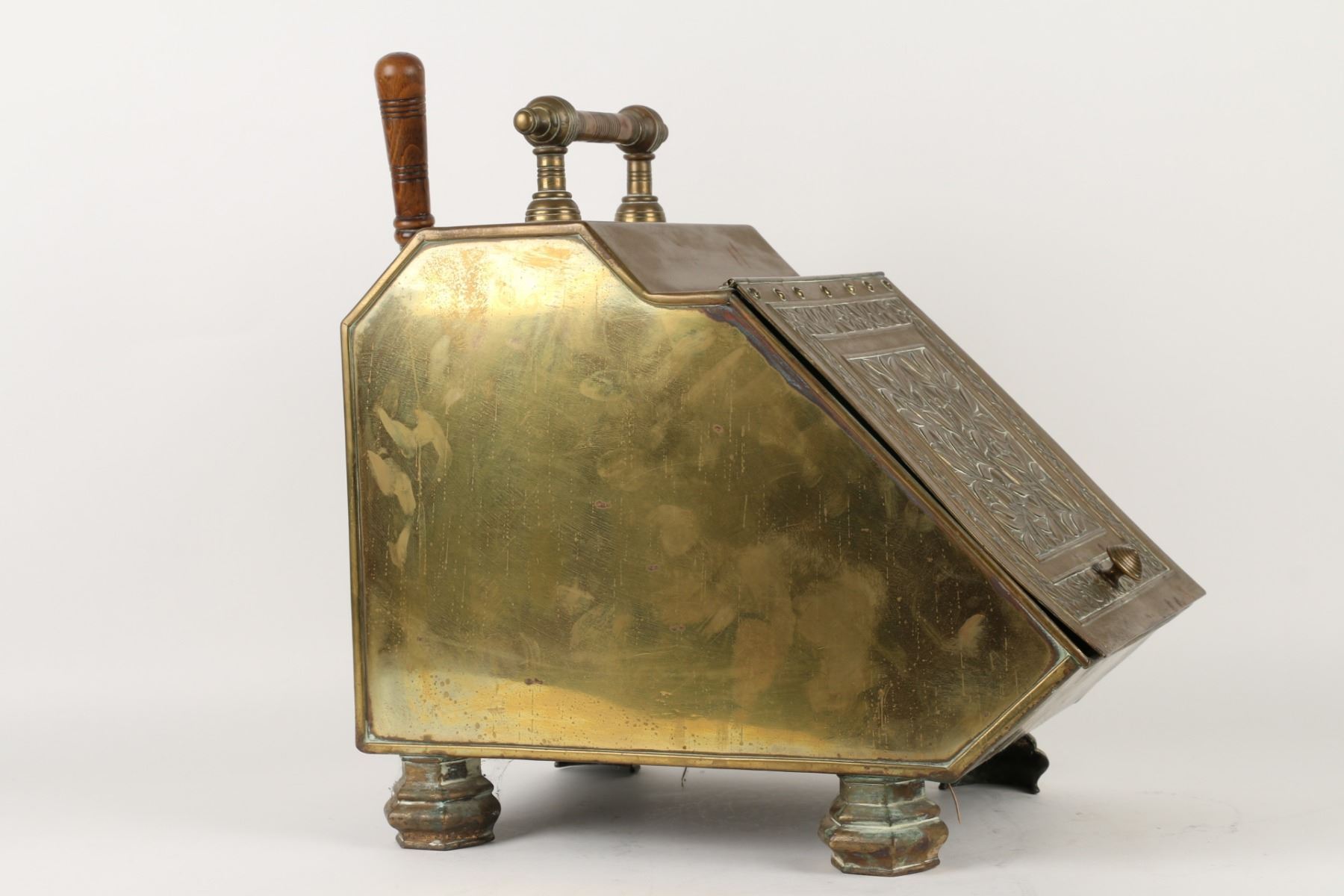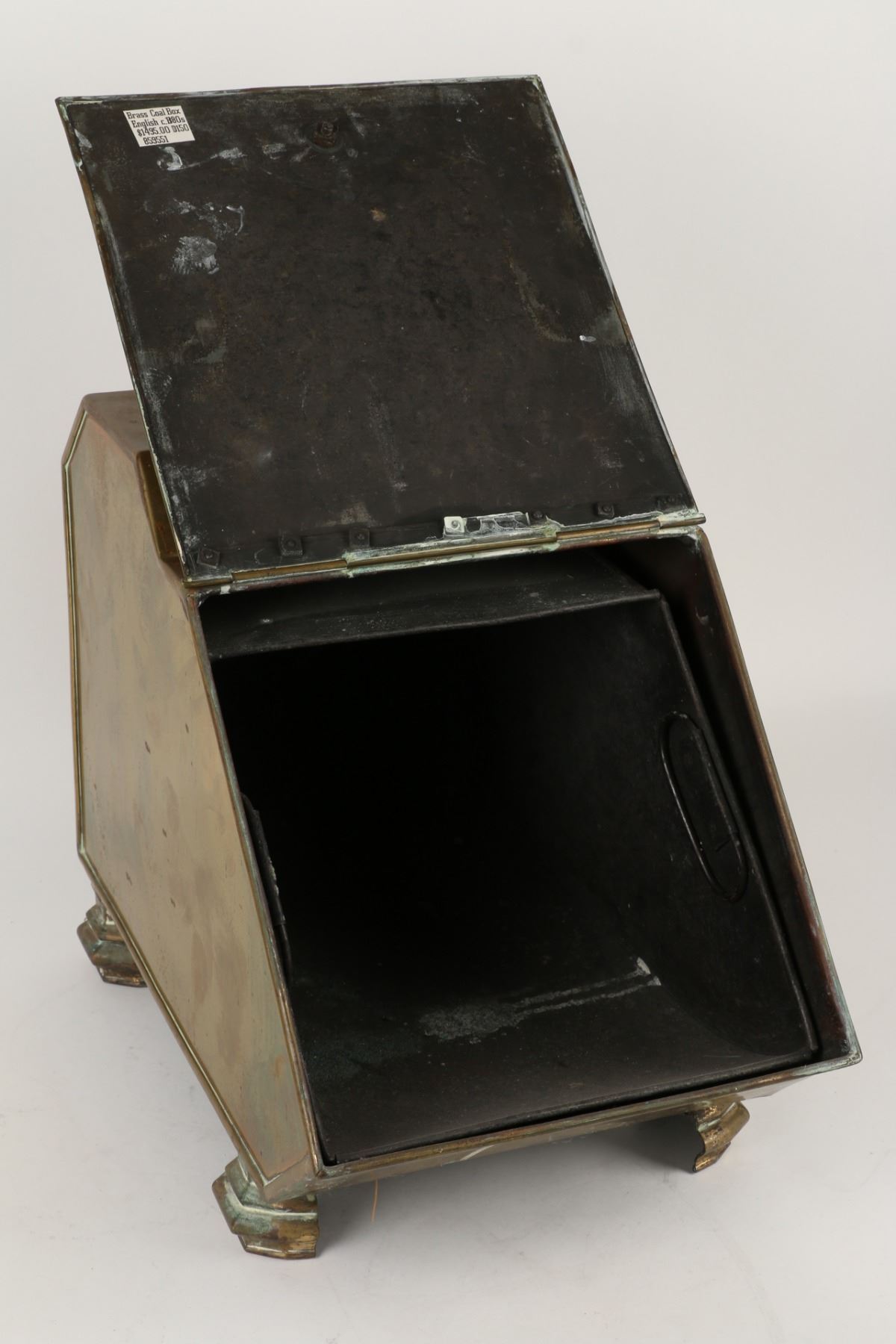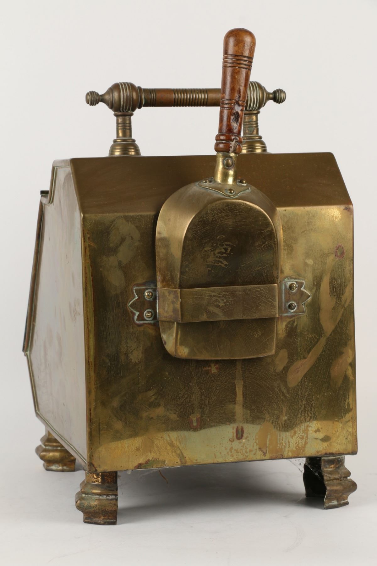 Lot 144 - Circa 1880s. Includes matching wood-handled brass scoop and tin insert. 17" x 11" x 19". $200-300.