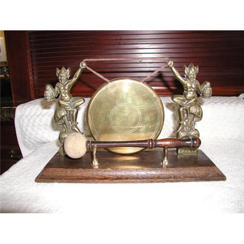 English Brass Dinner Gong. Gong is suspended by cord between two decorative brass pixies. Pixies are for Good Luck!! All brass is mounted on Wooden Oak base. Gong Mallet is made of suade material with Matching Oak handle. Excellent condition. Great addition to any Dinner Table or Antique Gong collection.