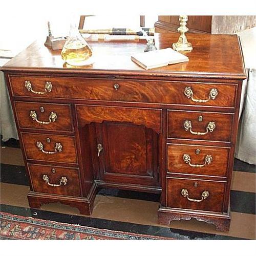 This English Mahogany Captain's desk is made in the Chippendale style with brass rosette pulls. The top drawer has many divided sections and is covered with a leather writing surface  (see pictures).  The hidden door inside the knee hole has a small drawer above it. The condition of this desk is excellent. The cock beaded drawers date the desk around 1850-1860. <p>If one has any further questions or would like us to supply other images of this article please don’t hesitate to email us. We will do our best to accommodate your request as soon as possible.