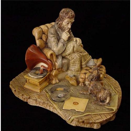English ceramic figurine of a music lover trying to listen to his old phonograph or Victrola while his dog howls. It is marked and numbered on the underside: No. 831 Serenade, Naturecraft Ltd., England. In very good used condition as shown with restoration. Please ask questions, request additional photos and shipping costs before buying.