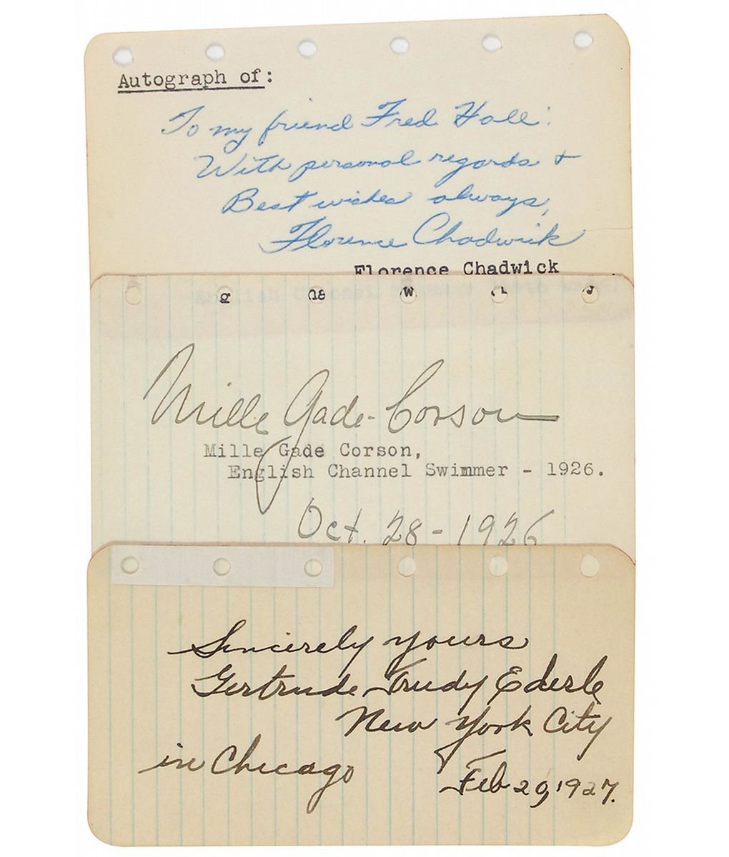 Vintage ink signatures of female swimmers of the English Channel on individual off-white 4.5 x 2.5 pages, two of which are lined. Signers are: Gertrude Ederle, Millie Gade Corson, and Florence Chadwick (ins). In overall fine condition, with light toning and reinforced binding holes to the Ederle page.