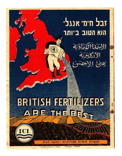 English Chemical Garbage is the Best - small color poster, Mandatory Palestine, poster shows a man spreading fertilizer from a large sack on a field, with map of England in the background. In verygood condition: 4 staple holes on right side of the poster, may have appeared in a newspaper judging by the ad on the reverse. Dimensions: 30.5X23 cm.