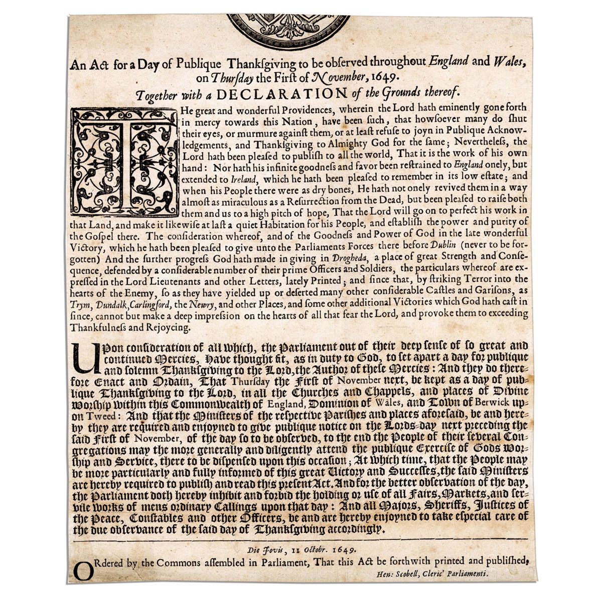 Broadside from the Third English Civil War creating a Thanksgiving holiday. Dated 11 October 1649, the House of Commons declaration reads in part: ''...the Parliament...have though fit, as in duty to God, to set apart a day for publique and solemn Thanksgiving to the Lord...'' Mention is also made of the city of Drogheda, then under siege as part of the Cromwellian conquest of Ireland that year. Parliament ruled under Oliver Cromwell following the English Civil War until 1660, a period of throne-less government called the English Interregnum. Broadside measures 9.5'' x 11.5''. Toning, foxing and irregularly trimmed edges. Mounted to paper to an overall size of 11'' x 18.5''. Very good.
