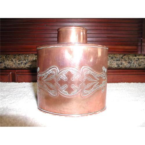 English Copper Tea Caddy. Tin lined. Front has decorative scroll work. Caddy has a few dents commensurate with age and use, but this does not detract from its beauty. Bottom is marked, "JS&SB" and the #4. Very collectable item. 31/2in X 4/3/4in.