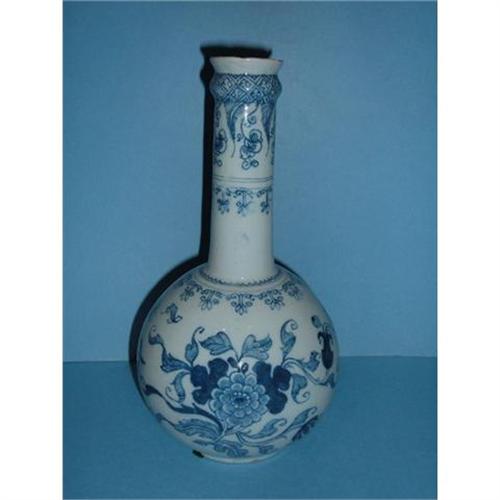 A tin glazed earthenware English Delft pottery bottle. Liverpool, circa 1760. Minor pitting and chips to base and rim. Neck has a good restoration.